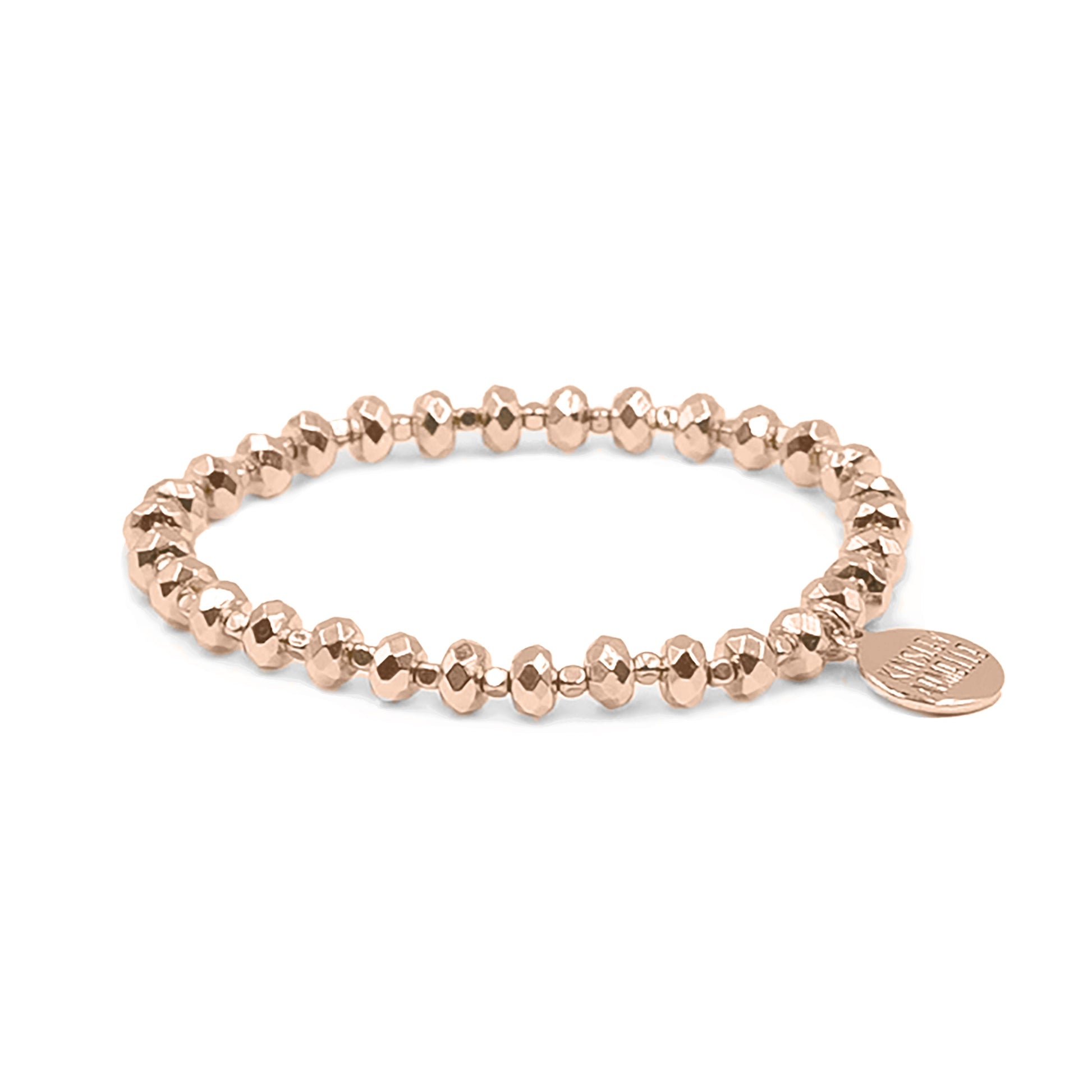 Rose Gold Faceted All Metal Beaded Stretch Bracelet. Custom 18K Rose Gold Ion Plated Stainless Steel Charm Accents And Designed With Love In Texas. Size Small, Medium, Large, and Extra Large Ranging From 6.25 - 7.25 Inch Circumference With Custom Sizing Available On Select Pieces.