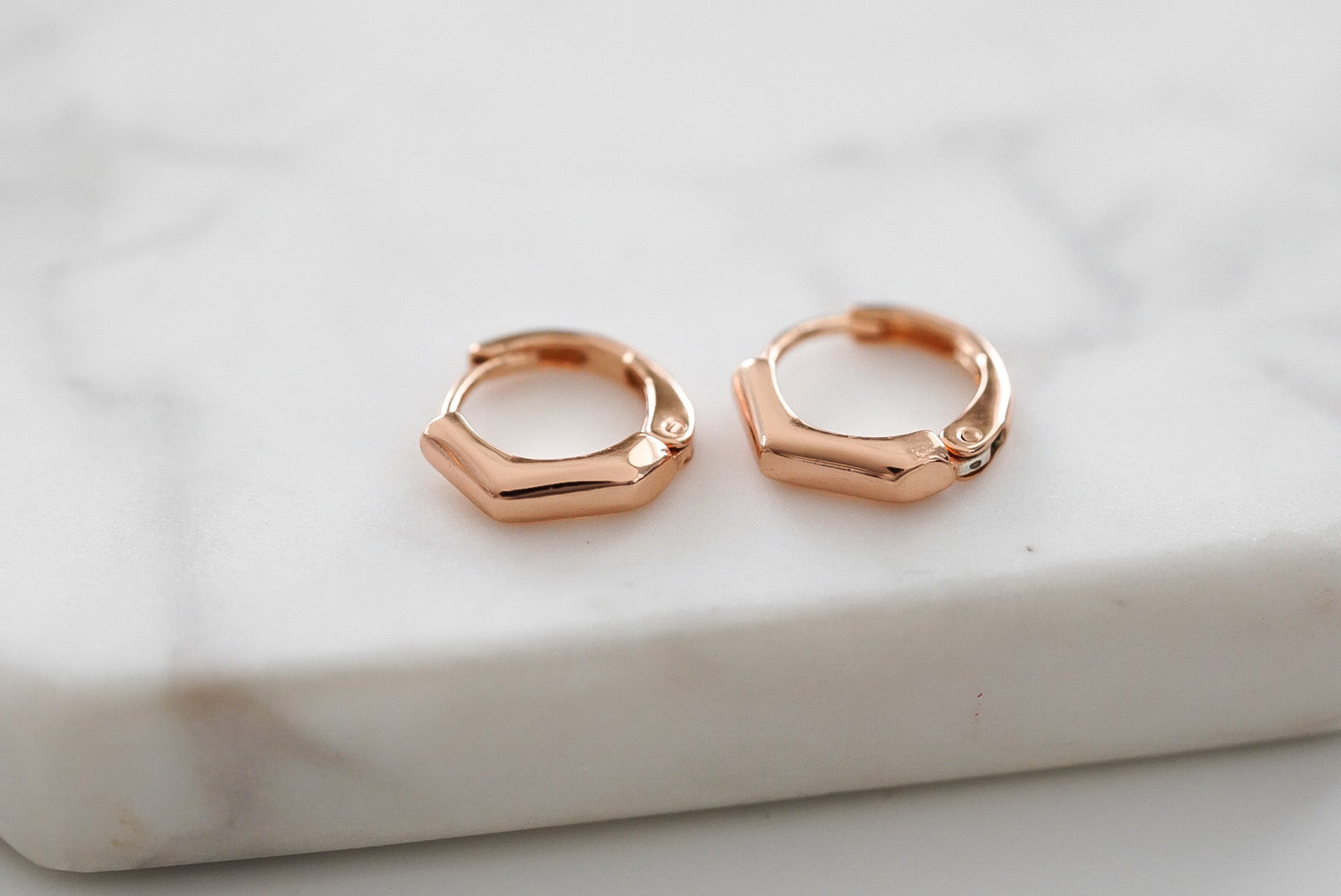 Rose Gold And Pink Huggie Featherweight Hypoallergenic Nickel Free Dainty Hoop Earrings. Custom Geometric Shapes Accents And Designed With Love In Texas. Size 1cm Length x 1cm Width With Custom Sizing Available On Select Pieces.