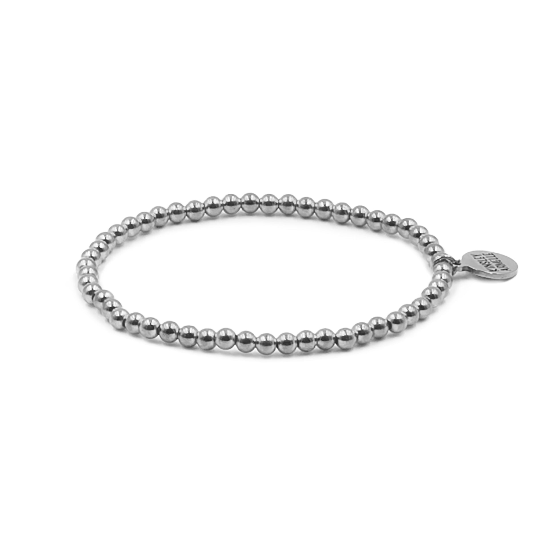 Silver And Gray Hypoallergenic Nickel Free Dainty Beaded Stretch Bracelet. Custom Silver Ion Plated Stainless Steel Charm Accents And Designed With Love In Texas. Size Small, Medium, Large, and Extra Large Ranging From 6.25 - 7.25 Inch Circumference With Custom Sizing Available On Select Pieces.