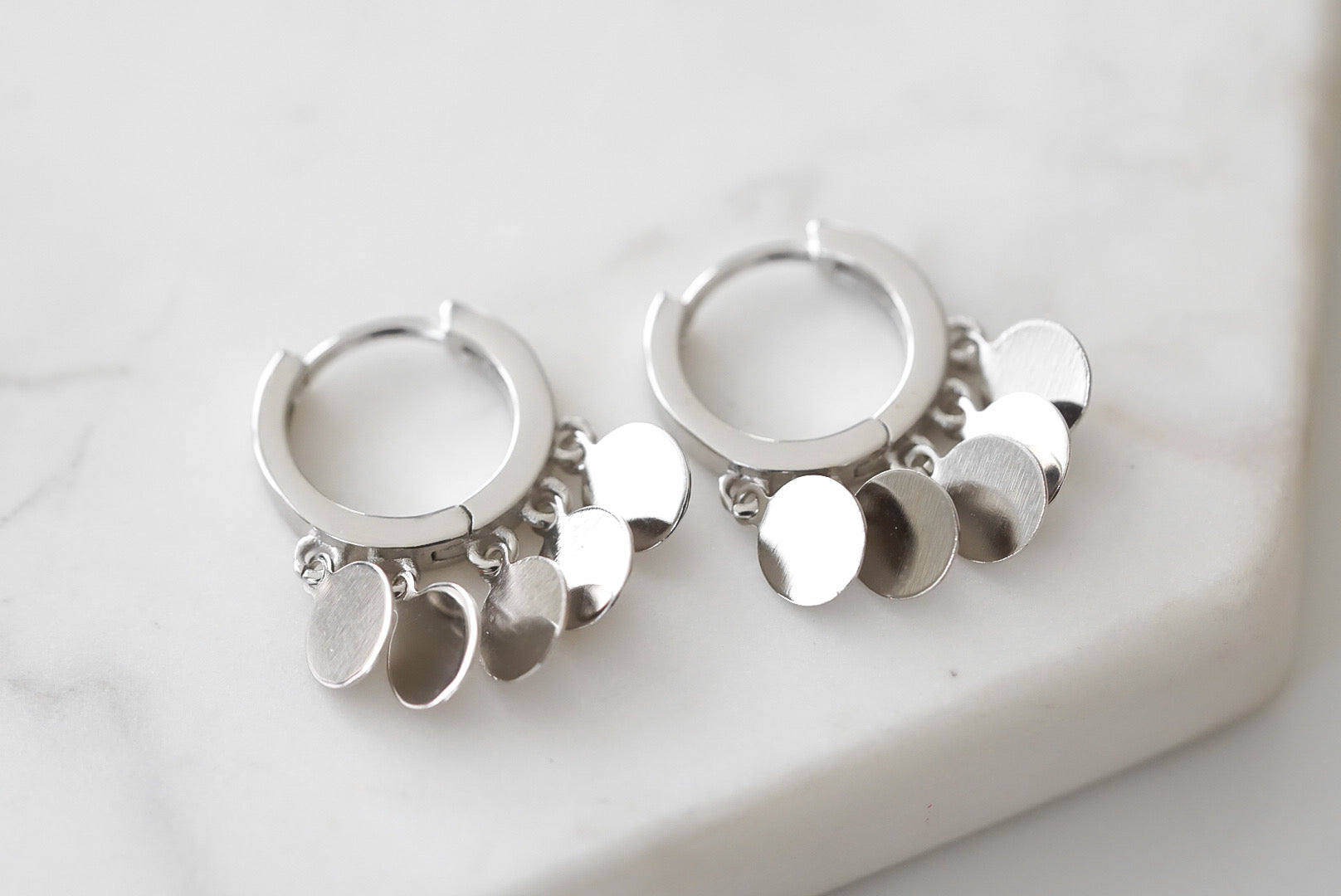 Silver And Gray Dangle Disc Hinged Huggie Featherweight Dainty Hoop Earrings. Custom Geometric Shapes Accents And Designed With Love In Texas. Size 2cm Length x 1.5cm Width With Custom Sizing Available On Select Pieces.