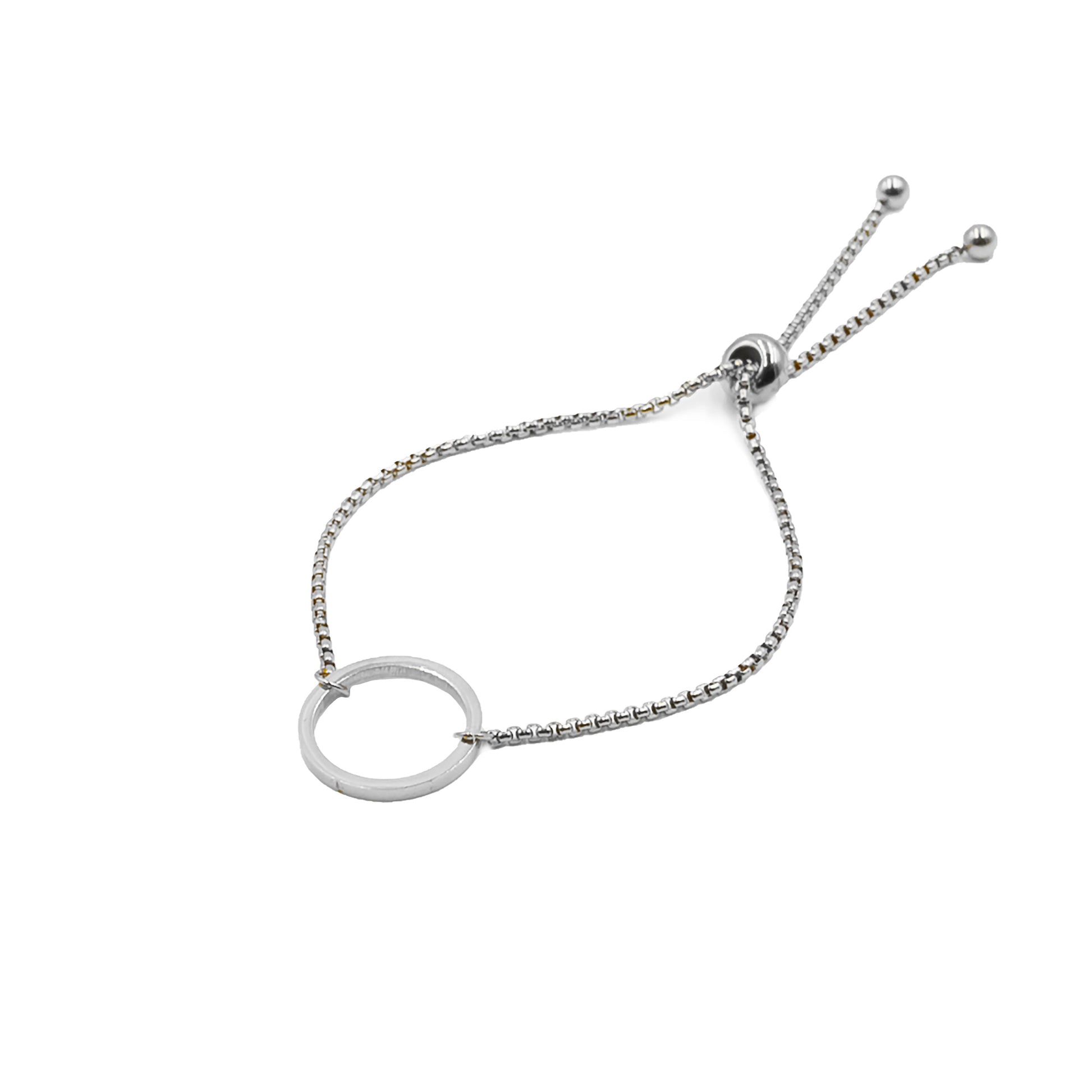 Silver And Gray Bolo Sliding Clasp Circle Hypoallergenic Nickel Free Dainty Adjustable Bracelet. Custom Geometric Shapes Accents And Designed With Love In Texas. Size 6-8.5 Inch Circumference With Custom Sizing Available On Select Pieces.