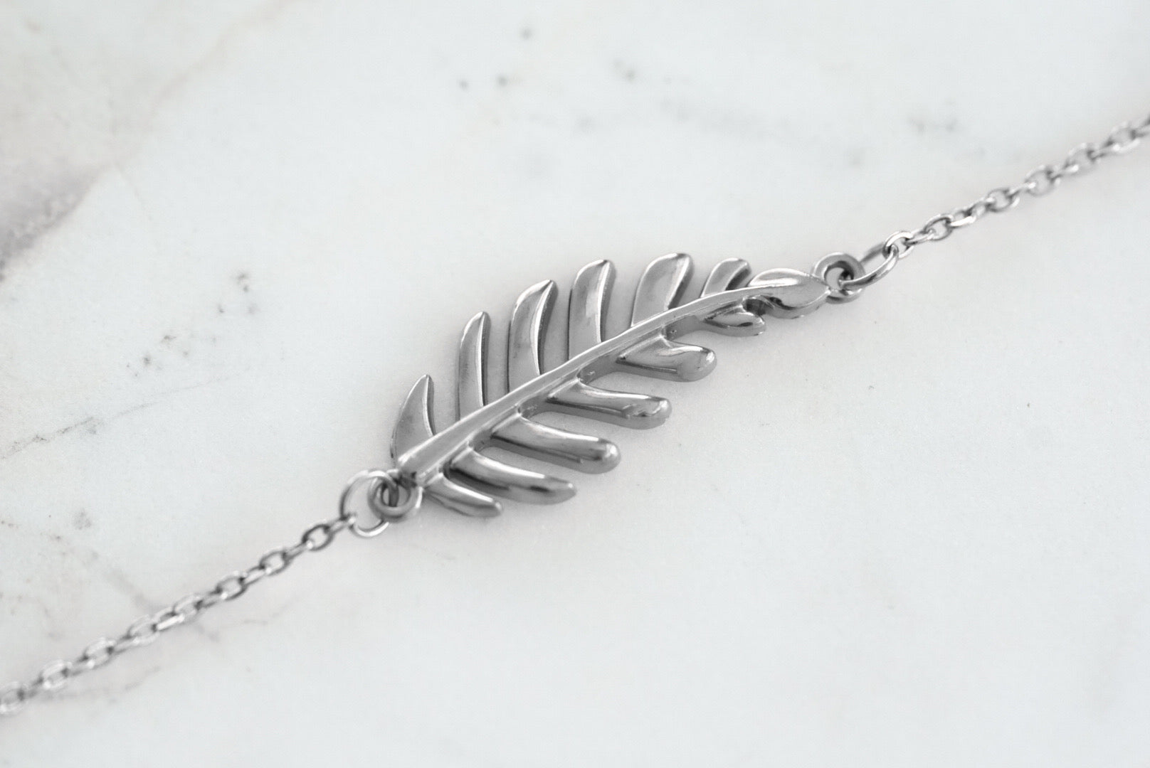 Silver And Gray Clasp Leaf Feather Hypoallergenic Nickel Free Dainty Adjustable Bracelet. Custom Geometric Shapes Accents And Designed With Love In Texas. Size 7.0 - 8.75 Inch Circumference With Custom Sizing Available On Select Pieces.