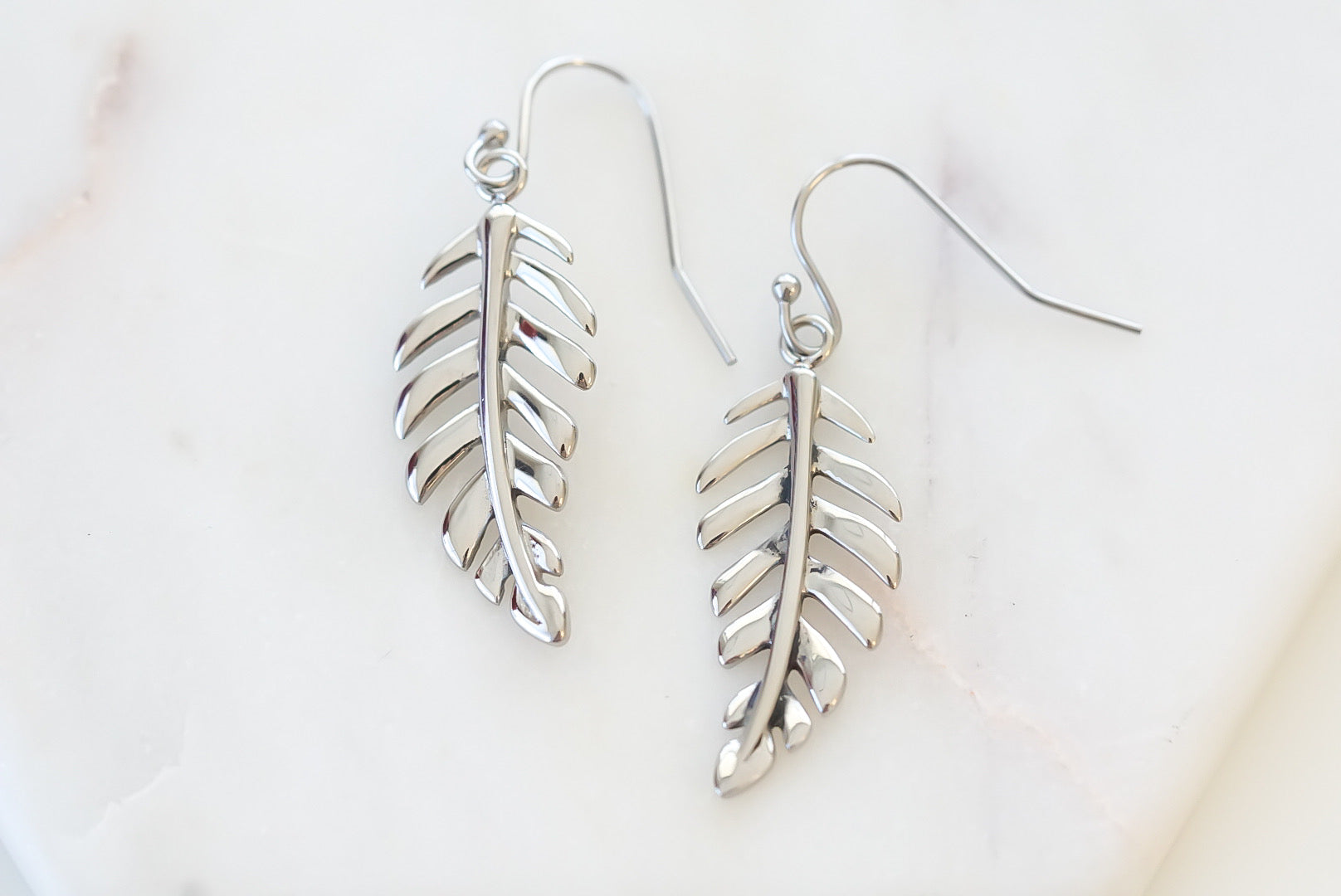 Silver Dangle Leaf Feather Featherweight Hypoallergenic Nickel Free All Metal Drop Earrings. Custom Geometric Shapes Accents And Designed With Love In Texas. Size 1.5 Inches Length x 0.5 Inch Width With Custom Sizing Available On Select Pieces.