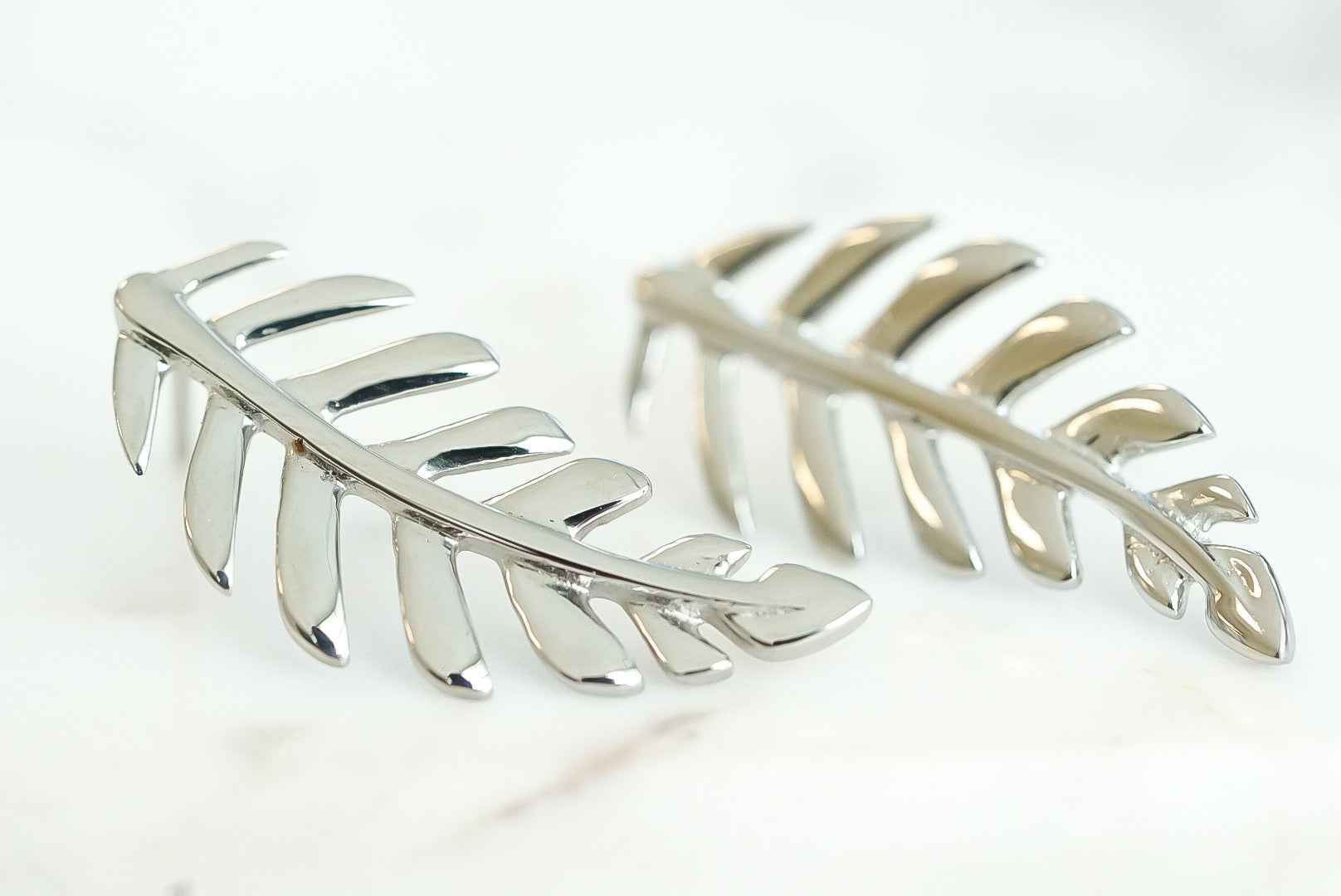 Silver Climber Leaf Feather Featherweight Hypoallergenic Nickel Free All Metal Stud Earrings. Custom Geometric Shapes Accents And Designed With Love In Texas. Size 3cm Long x 1 cm Wide With Custom Sizing Available On Select Pieces.