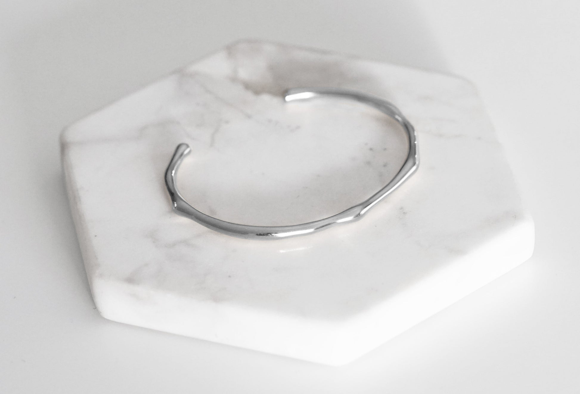 Silver And Gray Hammered Hypoallergenic Nickel Free Dainty Bangle Cuff Bracelet. Custom Geometric Shapes Accents And Designed With Love In Texas. Size Small, Medium, Large, and Extra Large Ranging From 6.25 - 7.25 Inch Circumference With Custom Sizing Available On Select Pieces.