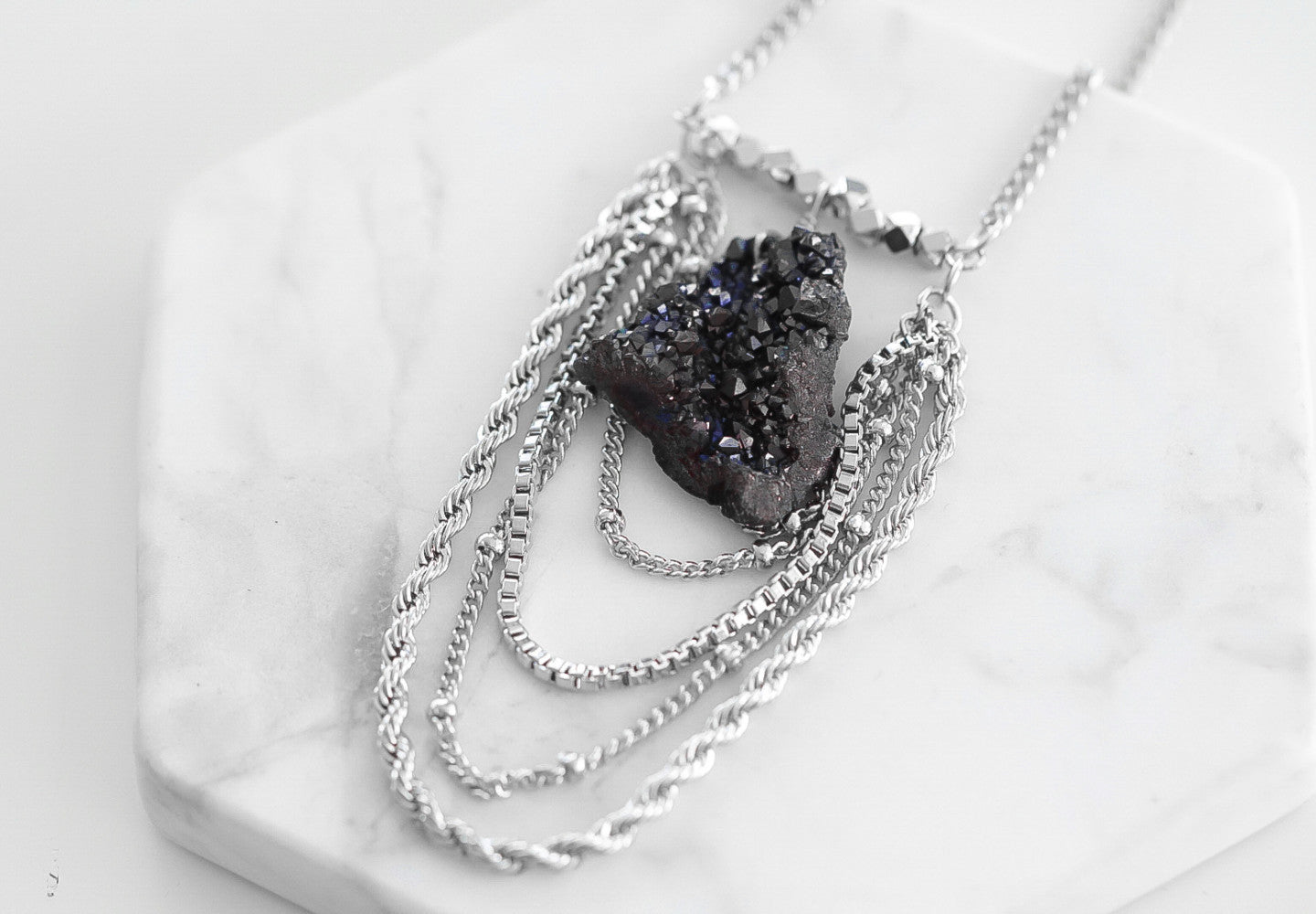 Silver And Black Chain Layered Natural Stone Raw Hypoallergenic Nickel Free Pendant Necklace. Custom Druzy Raw Natural Quartz Stone Accents And Designed With Love In Texas. Size 26 or 32 Inch Length, Plus 3 Inch Attached Necklace Extender With Custom Sizing Available On Select Pieces.