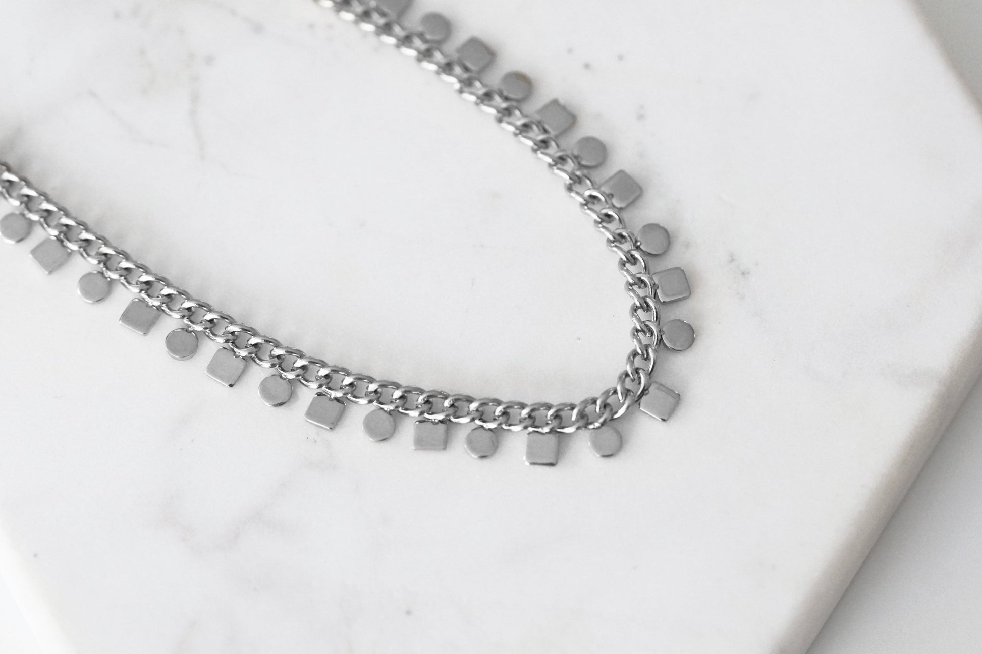 Silver Circle Geometric Square Hypoallergenic Nickel Free All Metal Choker Necklace. Custom Geometric Shapes Accents And Designed With Love In Texas. Size 14 or 18 Inch Length, Plus 3 Inch Attached Necklace Extender With Custom Sizing Available On Select Pieces.