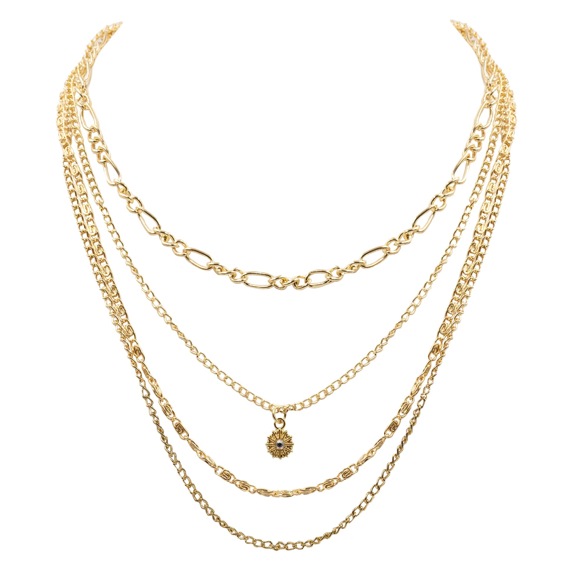 Gold Chain Dangle Layered Multistrand Station Hypoallergenic Nickel Free All Metal Layered Necklace. Custom Geometric Shapes Accents And Designed With Love In Texas. Size 14 Inches Length, Plus Attached 3 Inch Extender With Custom Sizing Available On Select Pieces.