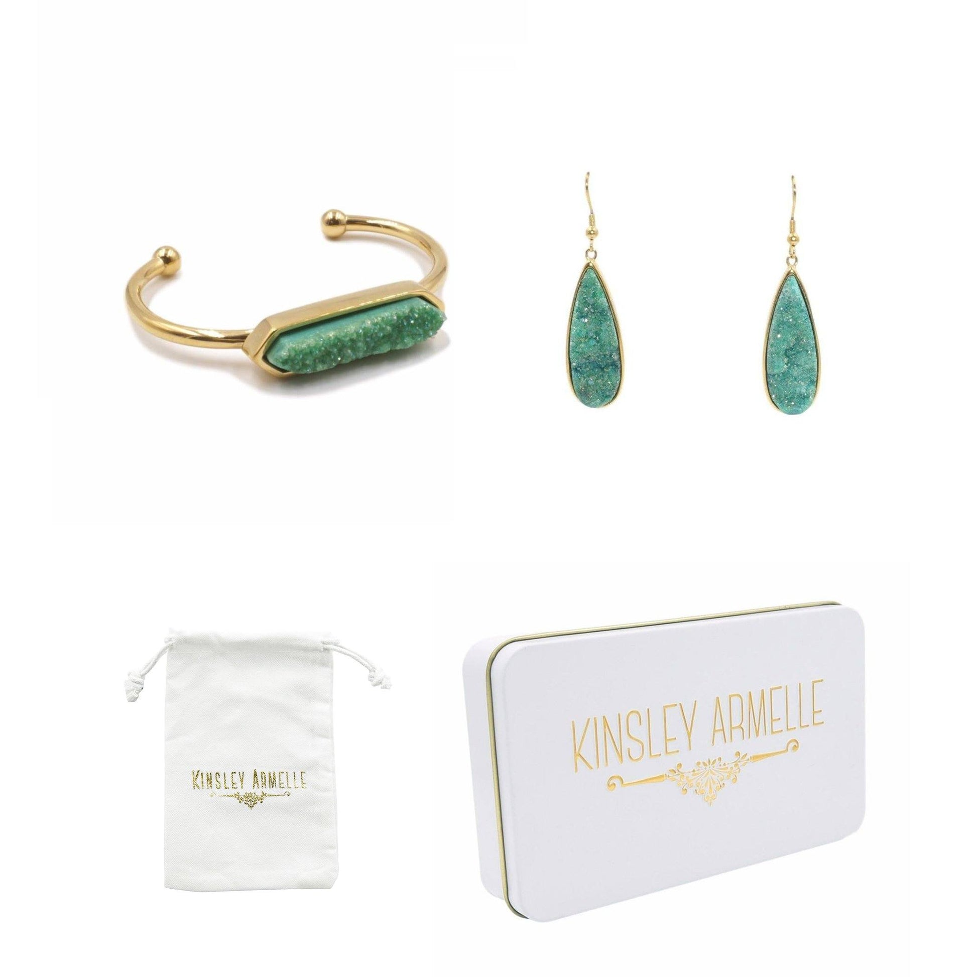 Gold And Green Cuff Drop Druzy Jewelry Set Matching Set Natural Stone Crystal Gemstone Pendant Raw Hypoallergenic Nickel Free Jewelry & Bracelet Stack Set. Custom Druzy Raw Natural Quartz Stone Accents And Designed With Love In Texas. Size Bracelet: 6.5 - 8 Inch Circumference | Earrings: 2.5 Inches Length x 0.5 Inches Width With Custom Sizing Available On Select Pieces.