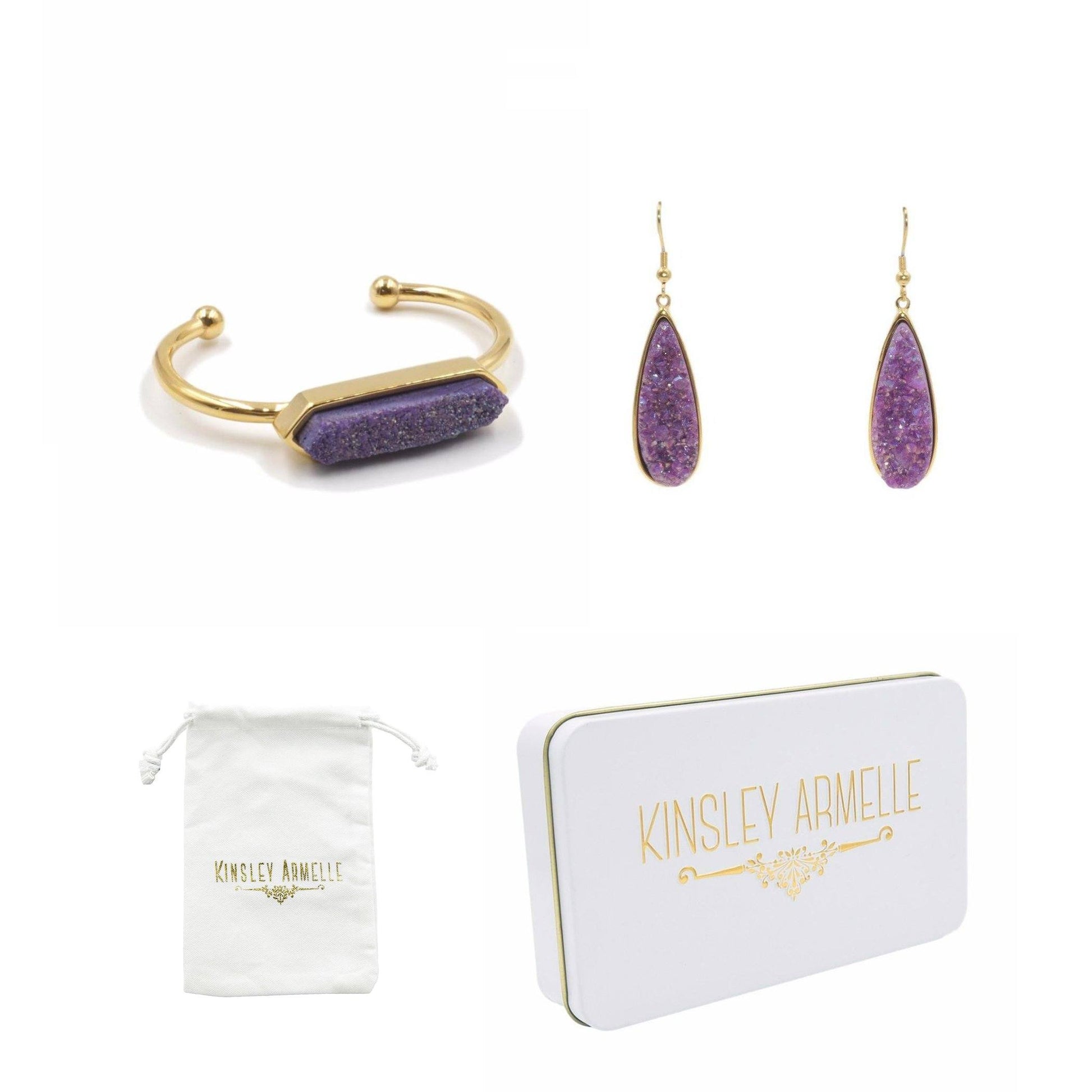 Gold And Purple Cuff Drop Druzy Jewelry Set Matching Set Natural Stone Crystal Gemstone Pendant Raw Hypoallergenic Nickel Free Jewelry & Bracelet Stack Set. Custom Druzy Raw Natural Quartz Stone Accents And Designed With Love In Texas. Size Bracelet: 6.5 - 8 Inch Circumference | Earrings: 2.5 Inches Length x 0.5 Inches Width With Custom Sizing Available On Select Pieces.
