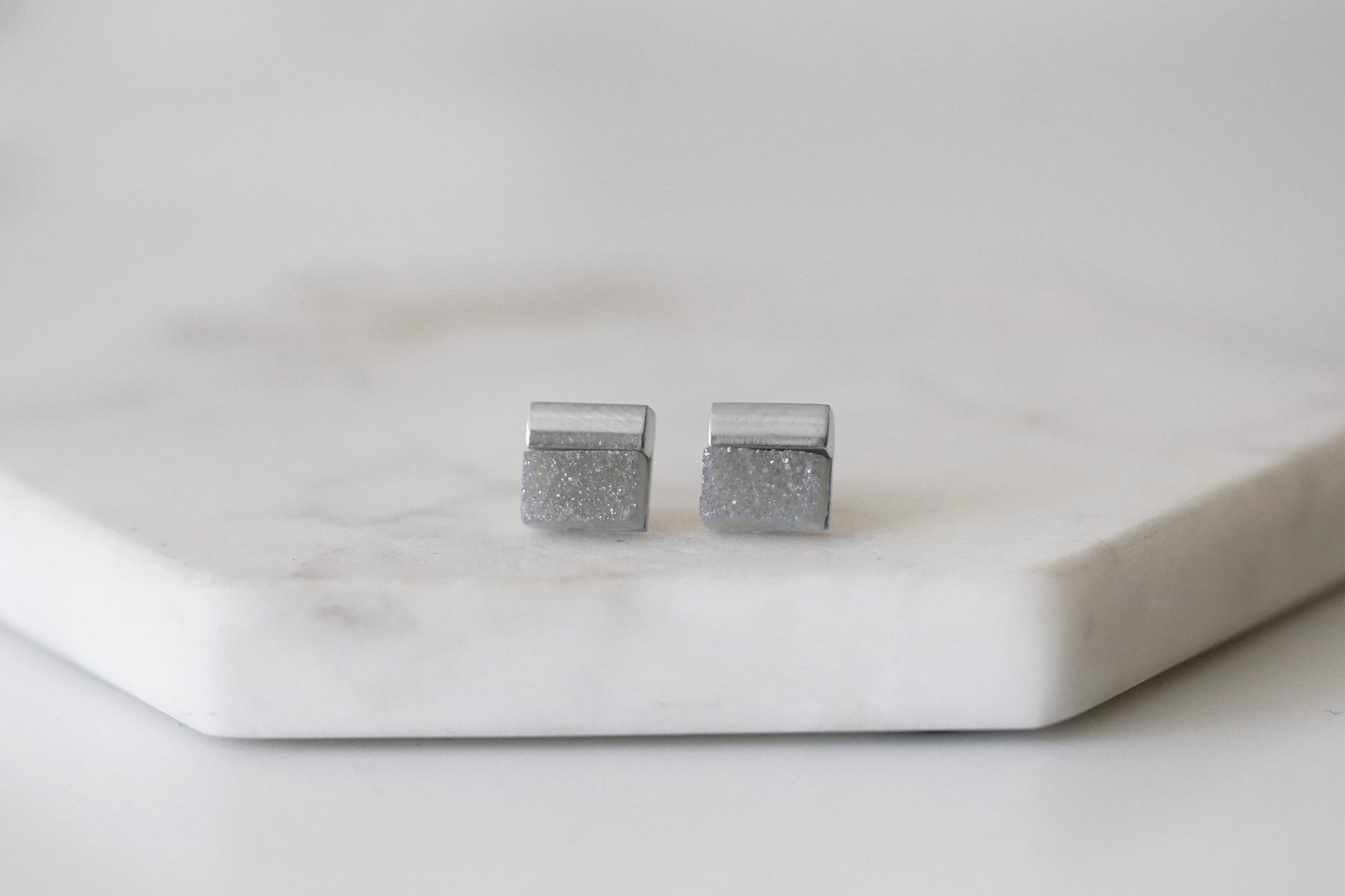 Silver And Gray Square Featherweight Hypoallergenic Nickel Free Stud Earrings. Custom Druzy Raw Natural Quartz Stone Accents And Designed With Love In Texas. Size 0.25 Inch Length x 0.25 Inch Width With Custom Sizing Available On Select Pieces.