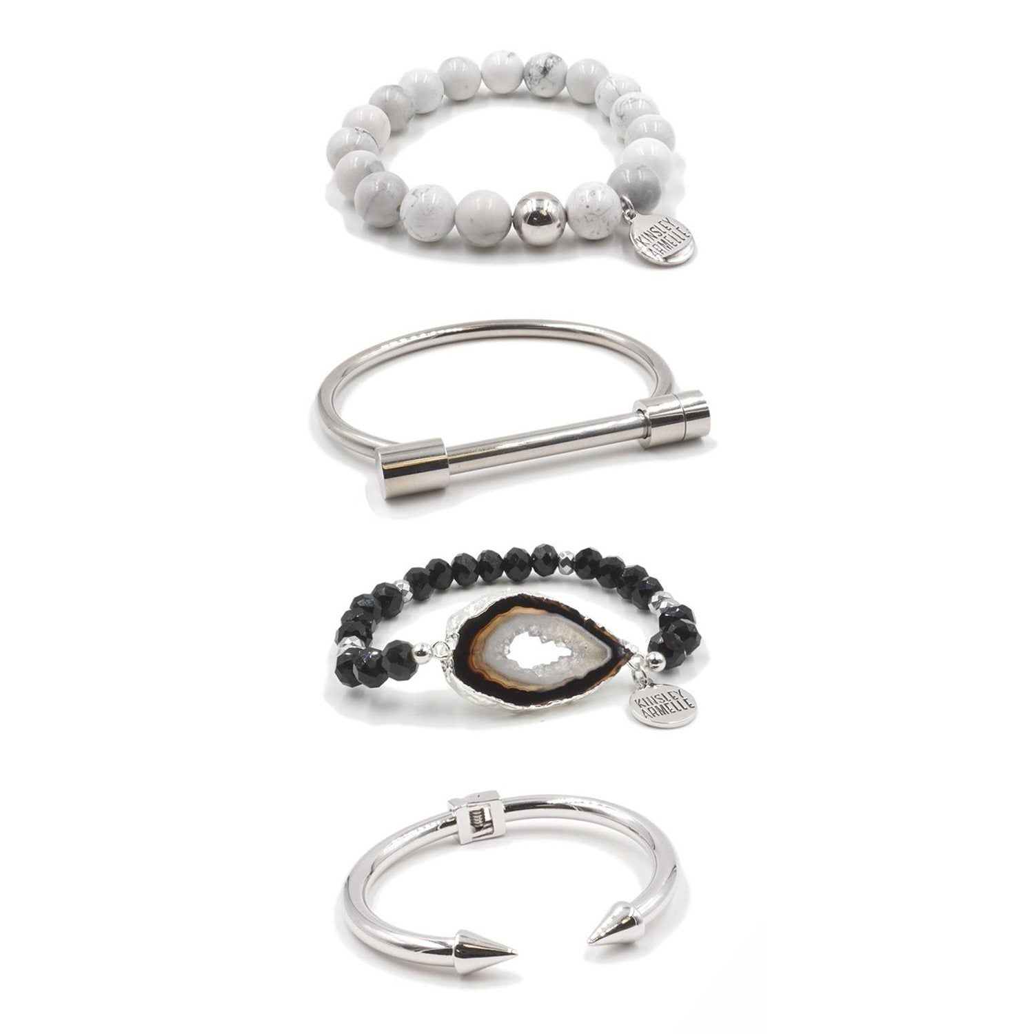 Silver And Gray Beads Hinged Marble Pave Screw Hypoallergenic Nickel Free Bracelet Stack Set. Custom Agate Slices Raw Natural Stone Accents And Designed With Love In Texas. Size Small, Medium, Large, and Extra Large Ranging From 6.25 - 7.25 Inch Circumference With Custom Sizing Available On Select Pieces.