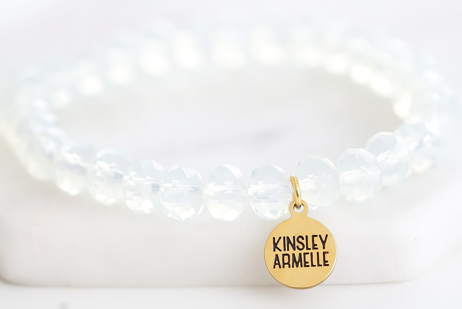 Gold And Light Blue Faceted Glossy Iridescent Hypoallergenic Nickel Free Beaded Stretch Bracelet. Custom 18K Yellow Gold Ion Plated Stainless Steel Charm Accents And Designed With Love In Texas. Size Small, Medium, Large, and Extra Large Ranging From 6.25 - 7.25 Inch Circumference With Custom Sizing Available On Select Pieces.