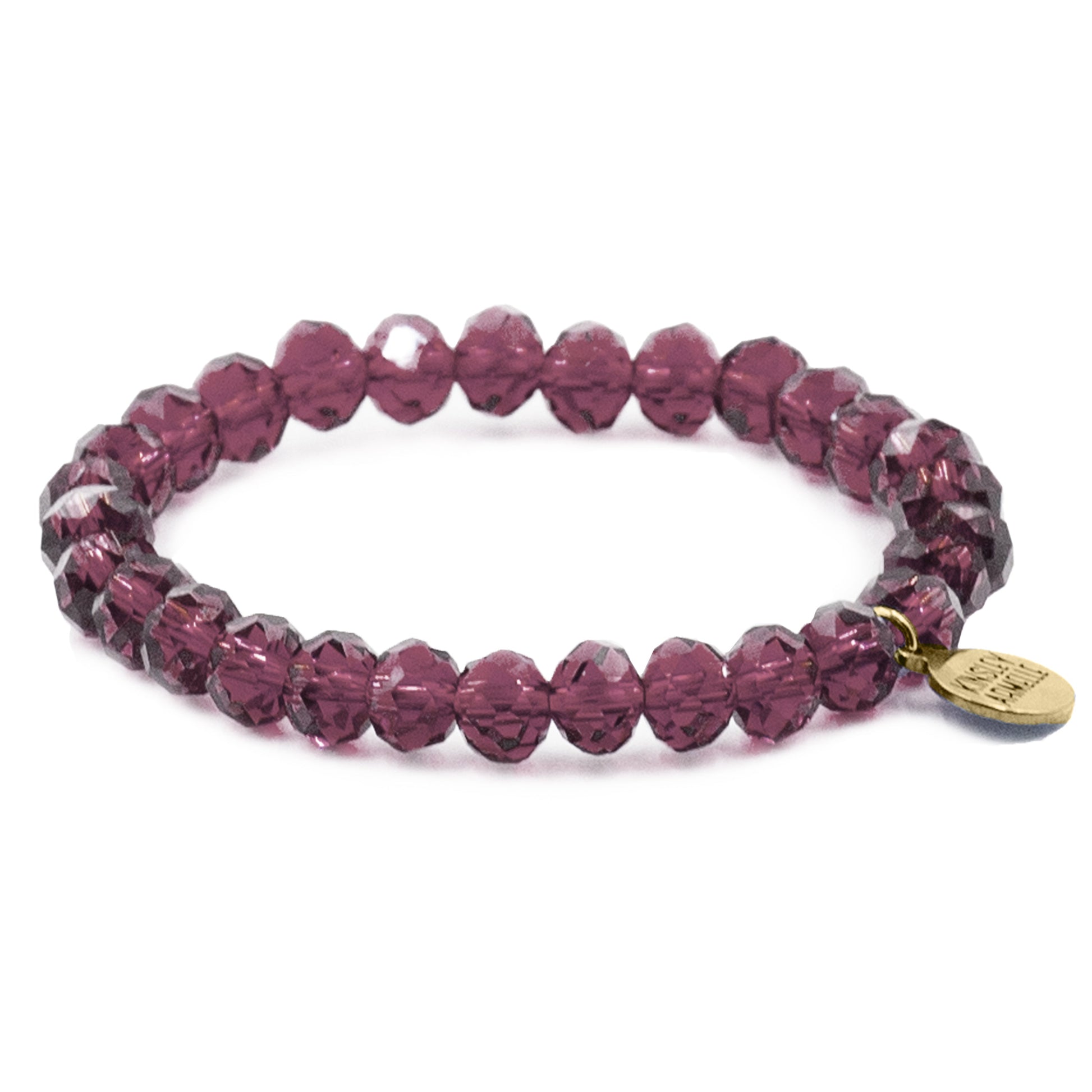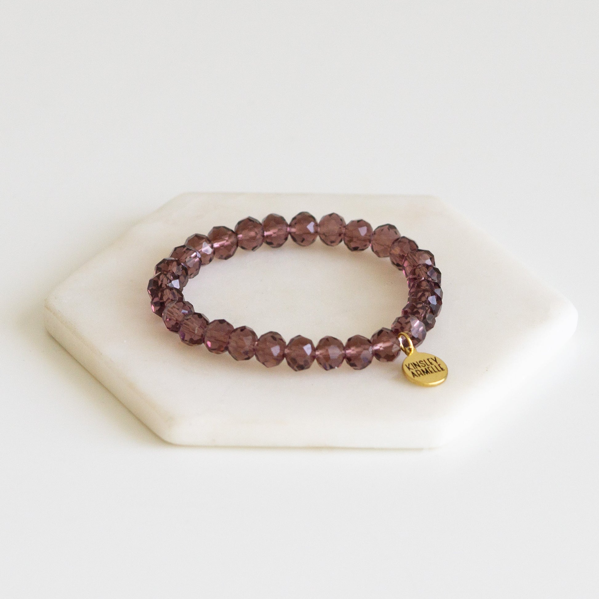 Gold And Purple Faceted Glossy Hypoallergenic Nickel Free Beaded Stretch Bracelet. Custom 18K Yellow Gold Ion Plated Stainless Steel Charm Accents And Designed With Love In Texas. Size Small, Medium, Large, and Extra Large Ranging From 6.25 - 7.25 Inch Circumference With Custom Sizing Available On Select Pieces.