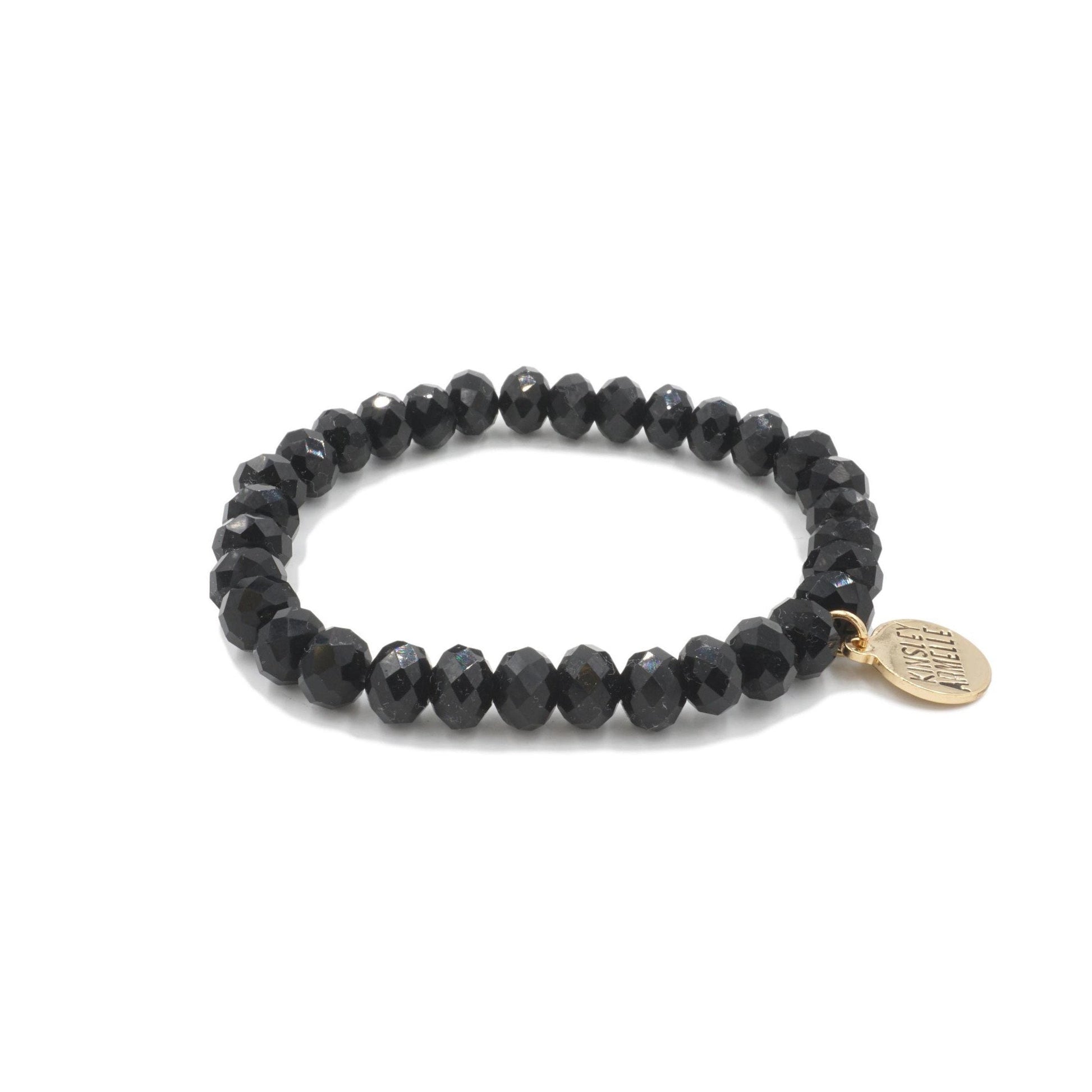 Gold And Black Faceted Glossy Hypoallergenic Nickel Free Beaded Stretch Bracelet. Custom 18K Yellow Gold Ion Plated Stainless Steel Charm Accents And Designed With Love In Texas. Size Small, Medium, Large, and Extra Large Ranging From 6.25 - 7.25 Inch Circumference With Custom Sizing Available On Select Pieces.
