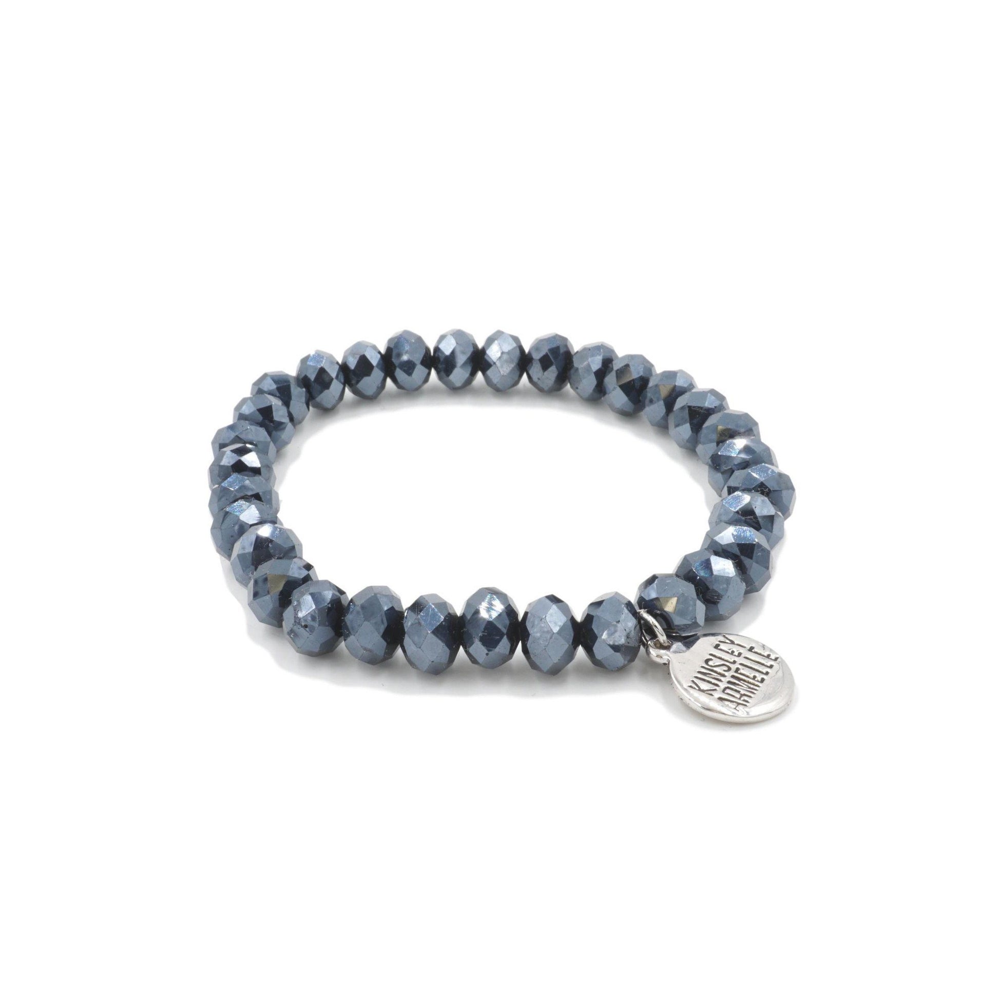 Silver And Blue Faceted Glossy Hypoallergenic Nickel Free Beaded Stretch Bracelet. Custom Silver Ion Plated Stainless Steel Charm Accents And Designed With Love In Texas. Size Small, Medium, Large, and Extra Large Ranging From 6.25 - 7.25 Inch Circumference With Custom Sizing Available On Select Pieces.
