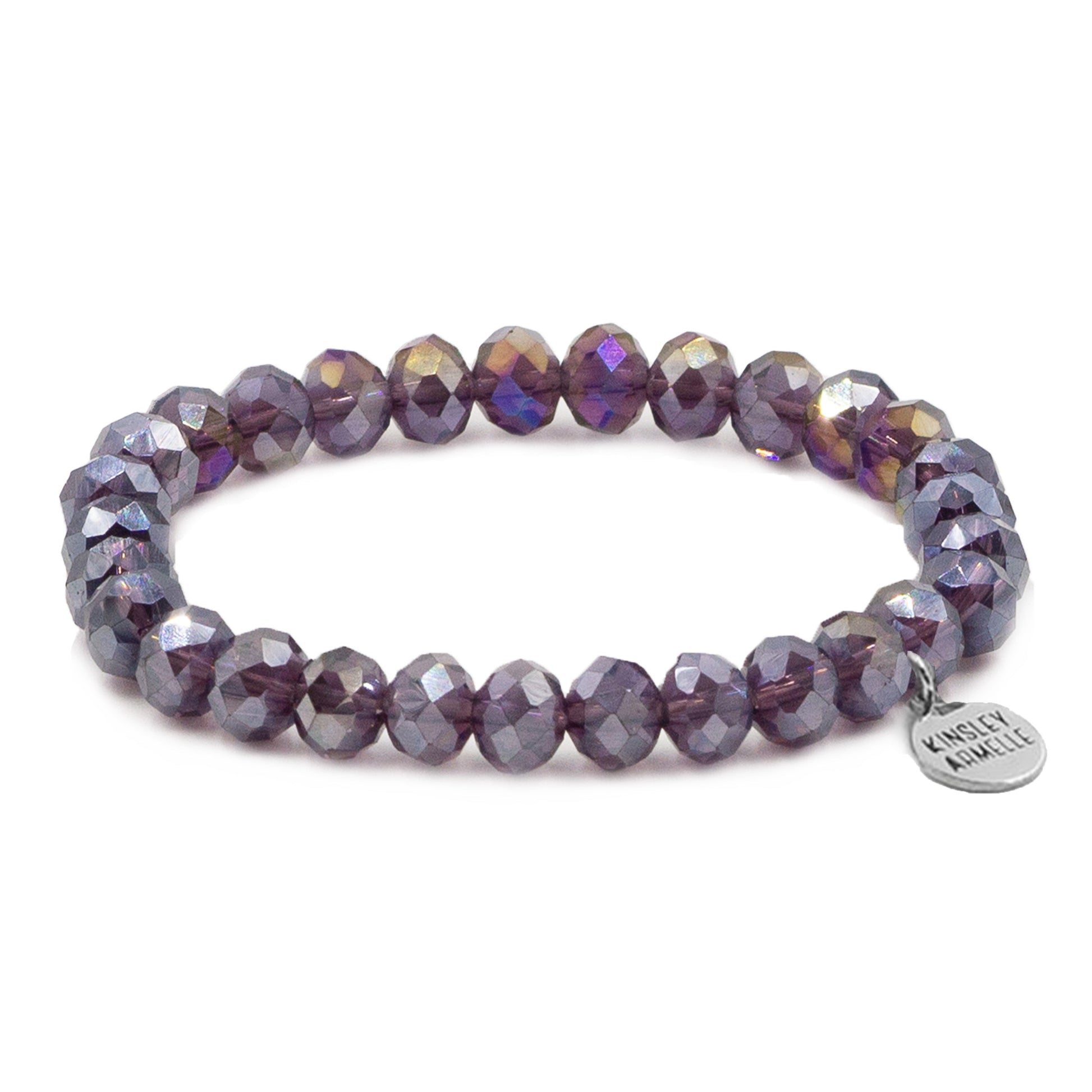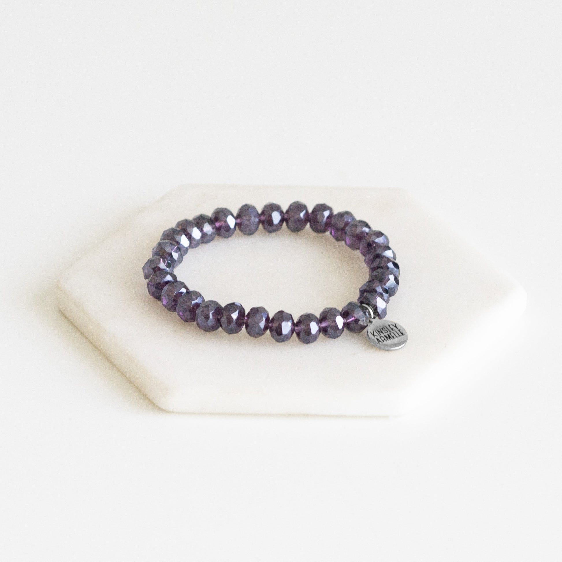 Silver And Purple Faceted Glossy Hypoallergenic Nickel Free Beaded Stretch Bracelet. Custom 18K Yellow Gold Ion Plated Stainless Steel Charm Accents And Designed With Love In Texas. Size Small, Medium, Large, and Extra Large Ranging From 6.25 - 7.25 Inch Circumference With Custom Sizing Available On Select Pieces.