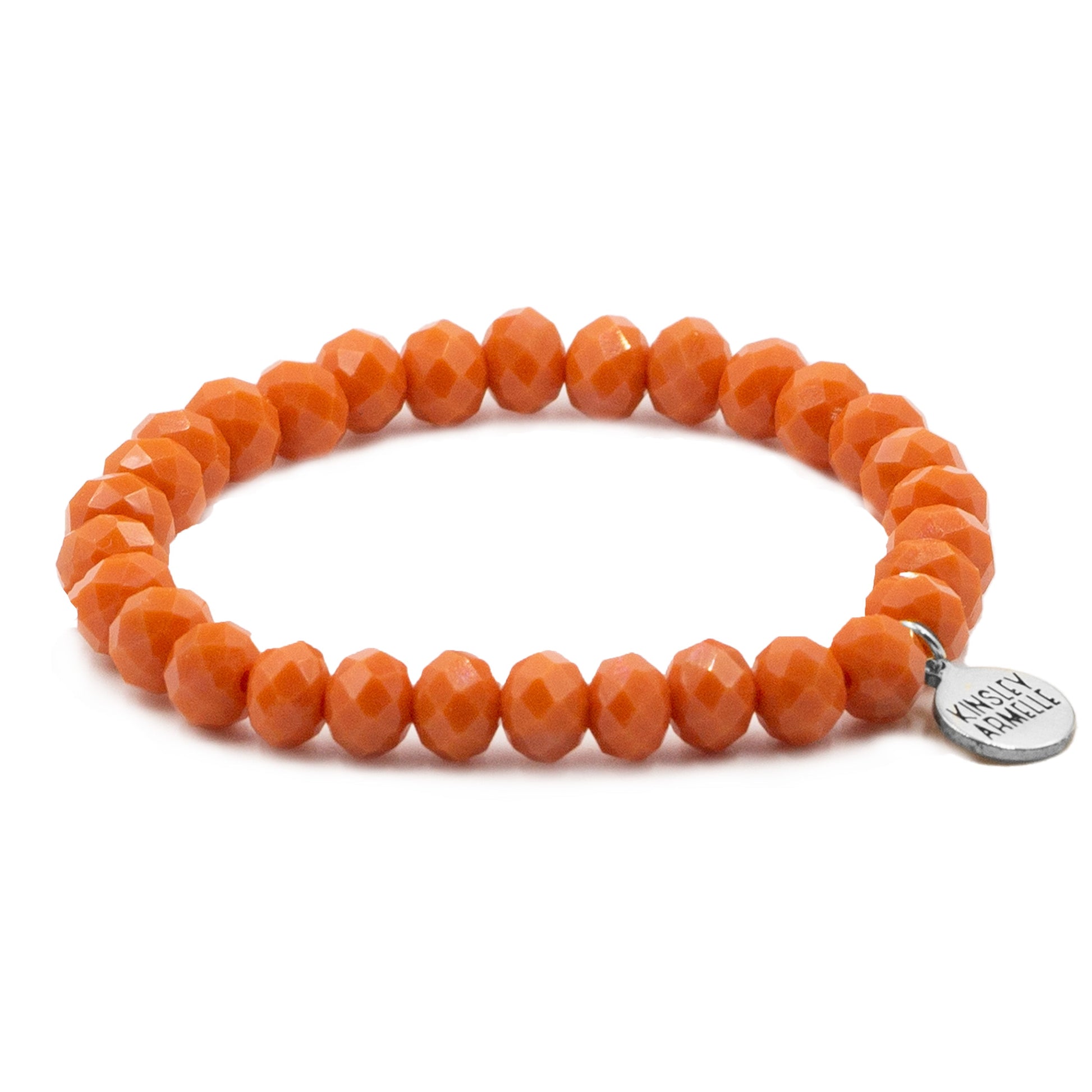 Silver And Orange Faceted Glossy Shimmering Sparkling Hypoallergenic Nickel Free Beaded Stretch Bracelet. Custom Silver Ion Plated Stainless Steel Charm Accents And Designed With Love In Texas. Size Small, Medium, Large, and Extra Large Ranging From 6.25 - 7.25 Inch Circumference With Custom Sizing Available On Select Pieces.