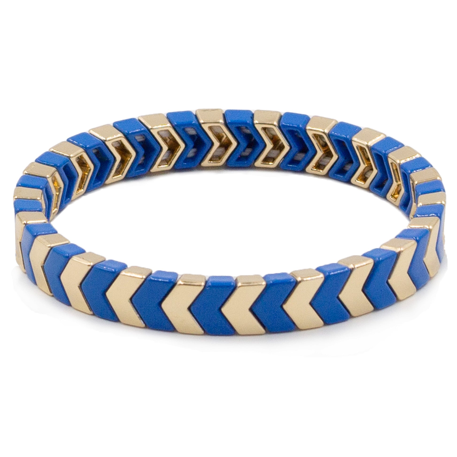 Gold And Blue Aztec Bold Beaded Stretch Bracelet. Custom Decorative Accent Beads Accents And Designed With Love In Texas. Size Small, Medium, Large, and Extra Large Ranging From 6.25 - 7.25 Inch Circumference With Custom Sizing Available On Select Pieces.