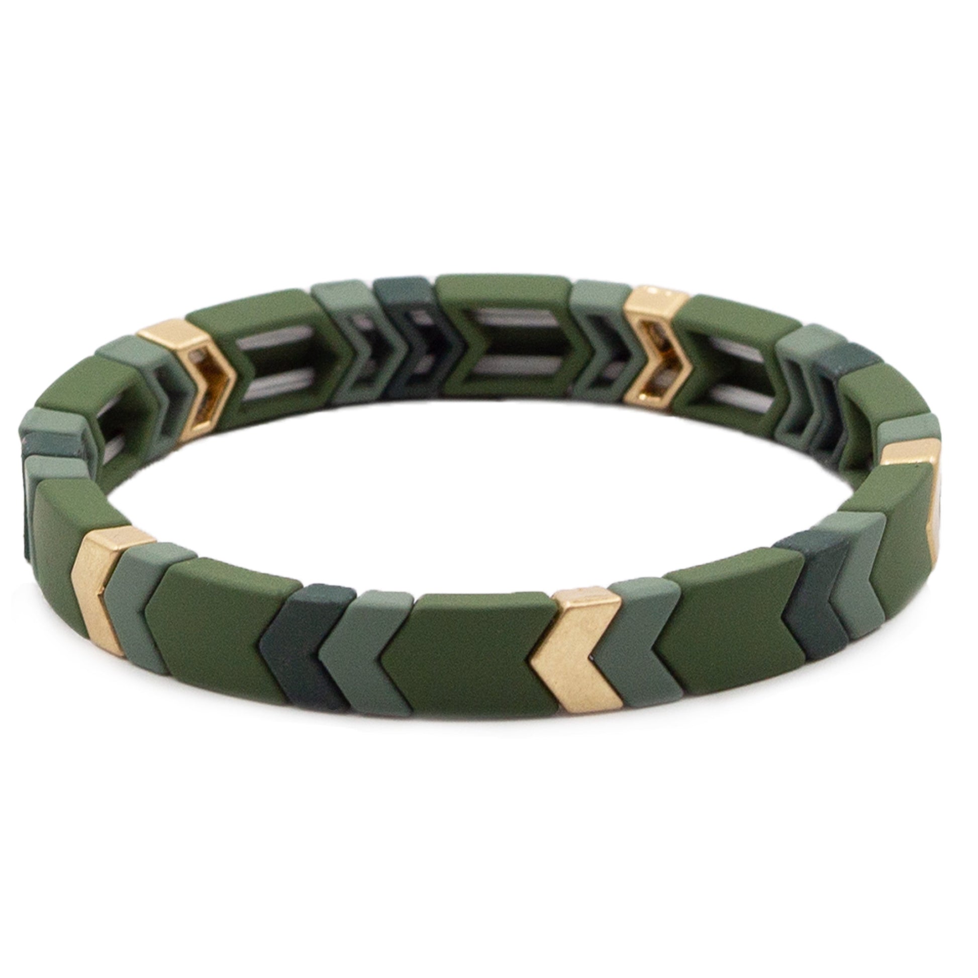 Gold And Green Aztec Statement Beaded Stretch Bracelet. Custom Decorative Accent Beads Accents And Designed With Love In Texas. Size Small, Medium, Large, and Extra Large Ranging From 6.25 - 7.25 Inch Circumference With Custom Sizing Available On Select Pieces.