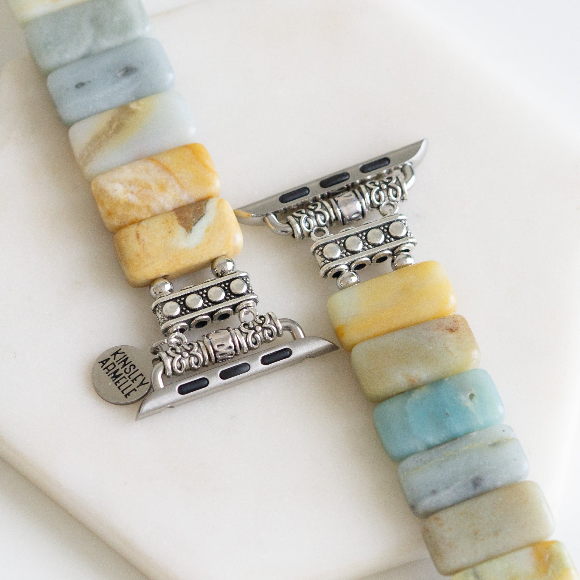Silver And Light Blue Multicolored Natural Stone Hypoallergenic Nickel Free Beaded Watch. Custom Silver Ion Plated Stainless Steel Geometric Shapes Accents And Designed With Love In Texas. Size 6.25 - 7.25 Inches Circumference With Custom Sizing Available On Select Pieces.