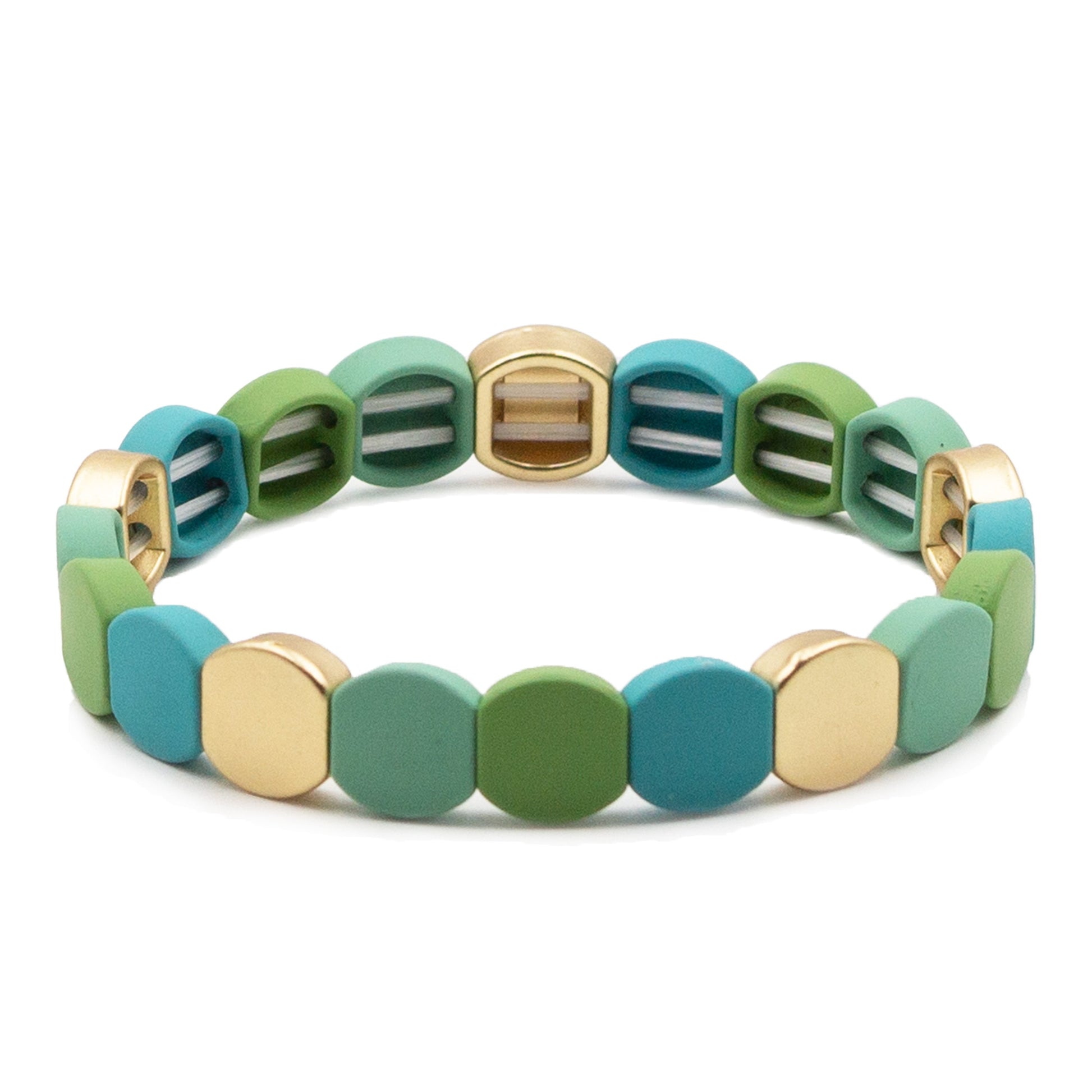 Gold And Green Aztec Blue Matte Multicolored Beaded Stretch Bracelet. Custom Decorative Accent Beads Accents And Designed With Love In Texas. Size Small, Medium, Large, and Extra Large Ranging From 6.25 - 7.25 Inch Circumference With Custom Sizing Available On Select Pieces.