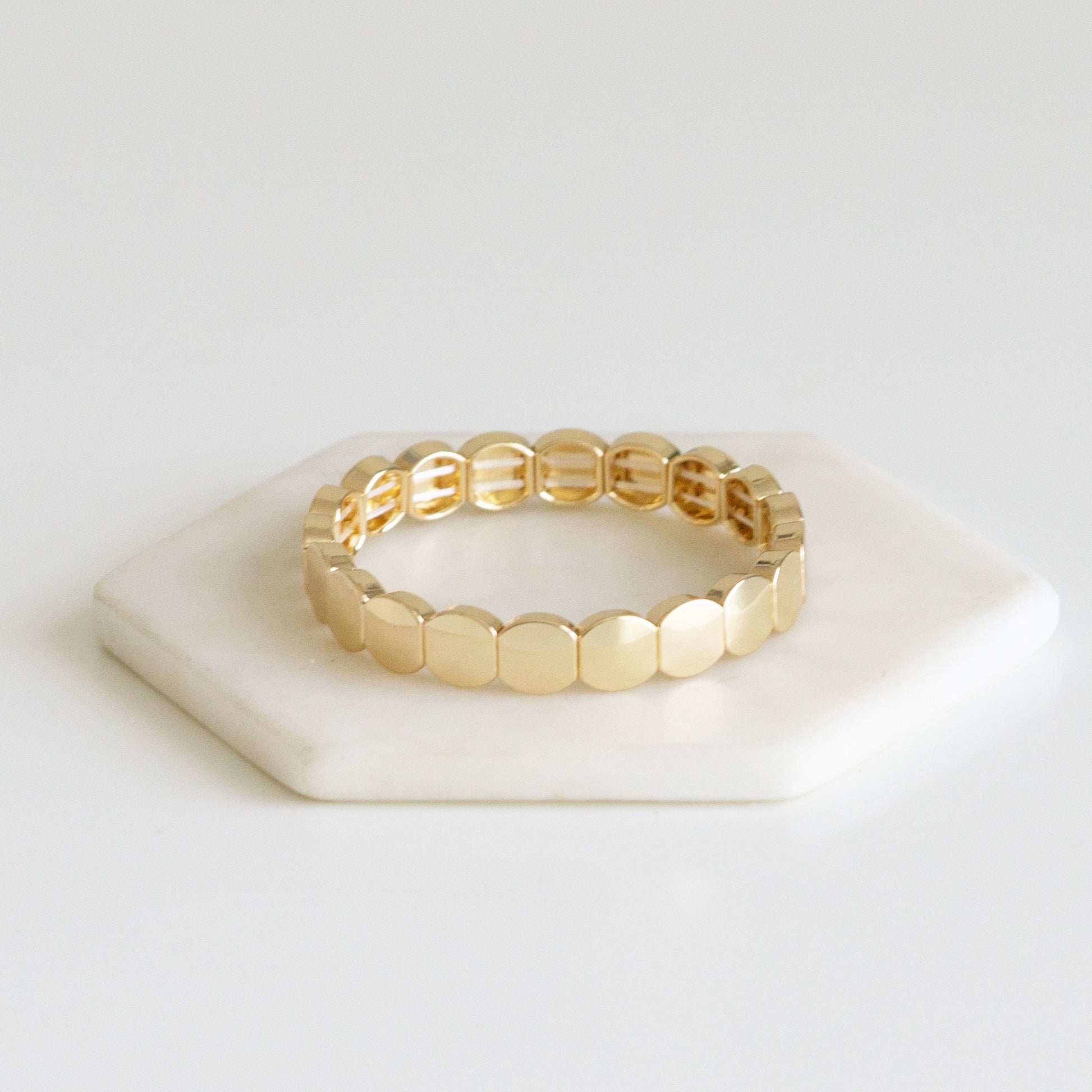 Gold Hypoallergenic Nickel Free All Metal Beaded Stretch Bracelet. Custom Geometric Shapes Accents And Designed With Love In Texas. Size Small, Medium, Large, and Extra Large Ranging From 6.25 - 7.25 Inch Circumference With Custom Sizing Available On Select Pieces.