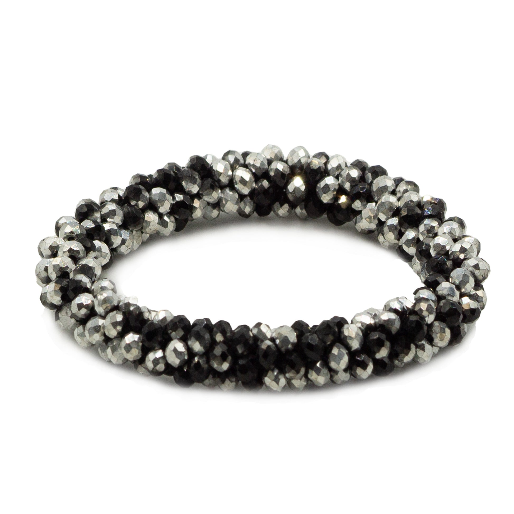 White And Black Faceted Hypoallergenic Nickel Free Beaded Stretch Bracelet. Custom Glass Glass Beads Accents And Designed With Love In Texas. Size Small, Medium, Large, and Extra Large Ranging From 6.25 - 7.25 Inch Circumference With Custom Sizing Available On Select Pieces.
