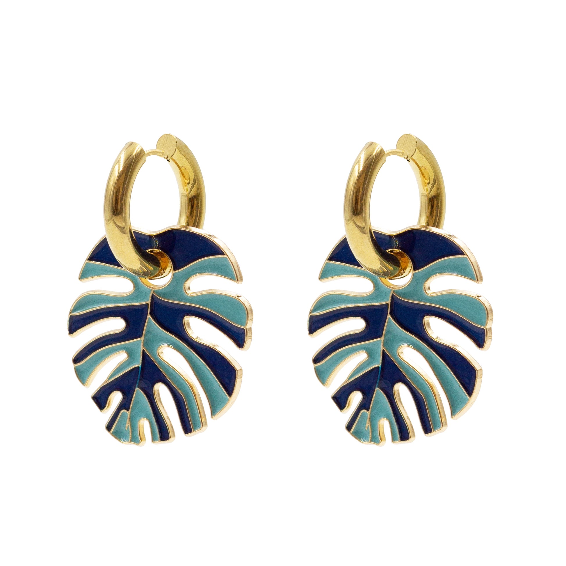 Gold And Blue Bold Hoop Tropical Two Toned Mediumweight Hypoallergenic Nickel Free Statement Drop Earrings. Custom Geometric Shapes Accents And Designed With Love In Texas. Size 1.75 Inches Length x 1.0 Inches Width With Custom Sizing Available On Select Pieces.