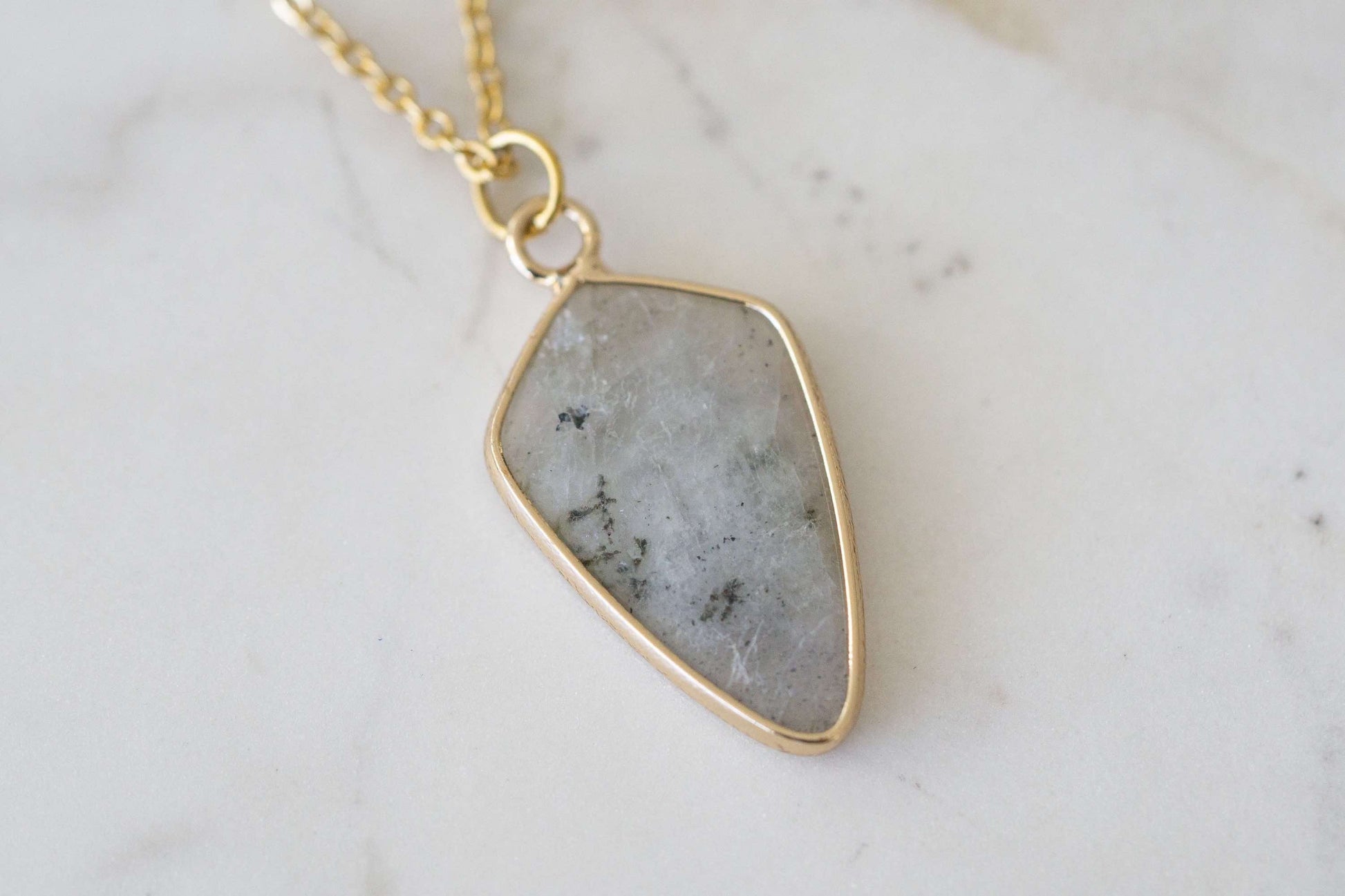 Gold And Green Dangle Natural Stone Crystal Gemstone Triangular Hypoallergenic Nickel Free Pendant Necklace. Custom Labradorite Raw Natural Stone Accents And Designed With Love In Texas. Size 18 or 22 Inch Length, Plus 3 Inch Attached Necklace Extender With Custom Sizing Available On Select Pieces.
