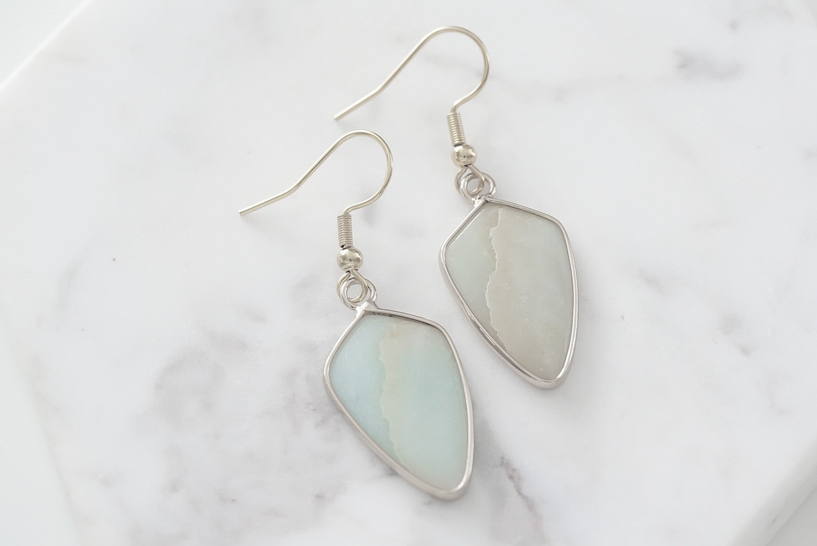 Silver And Light Blue Dangle Natural Stone Crystal Gemstone Triangular Featherweight Hypoallergenic Nickel Free Drop Earrings. Custom Amazonite Raw Natural Stone Accents And Designed With Love In Texas. Size 1 Inches Length x 0.75 Inches Width With Custom Sizing Available On Select Pieces.