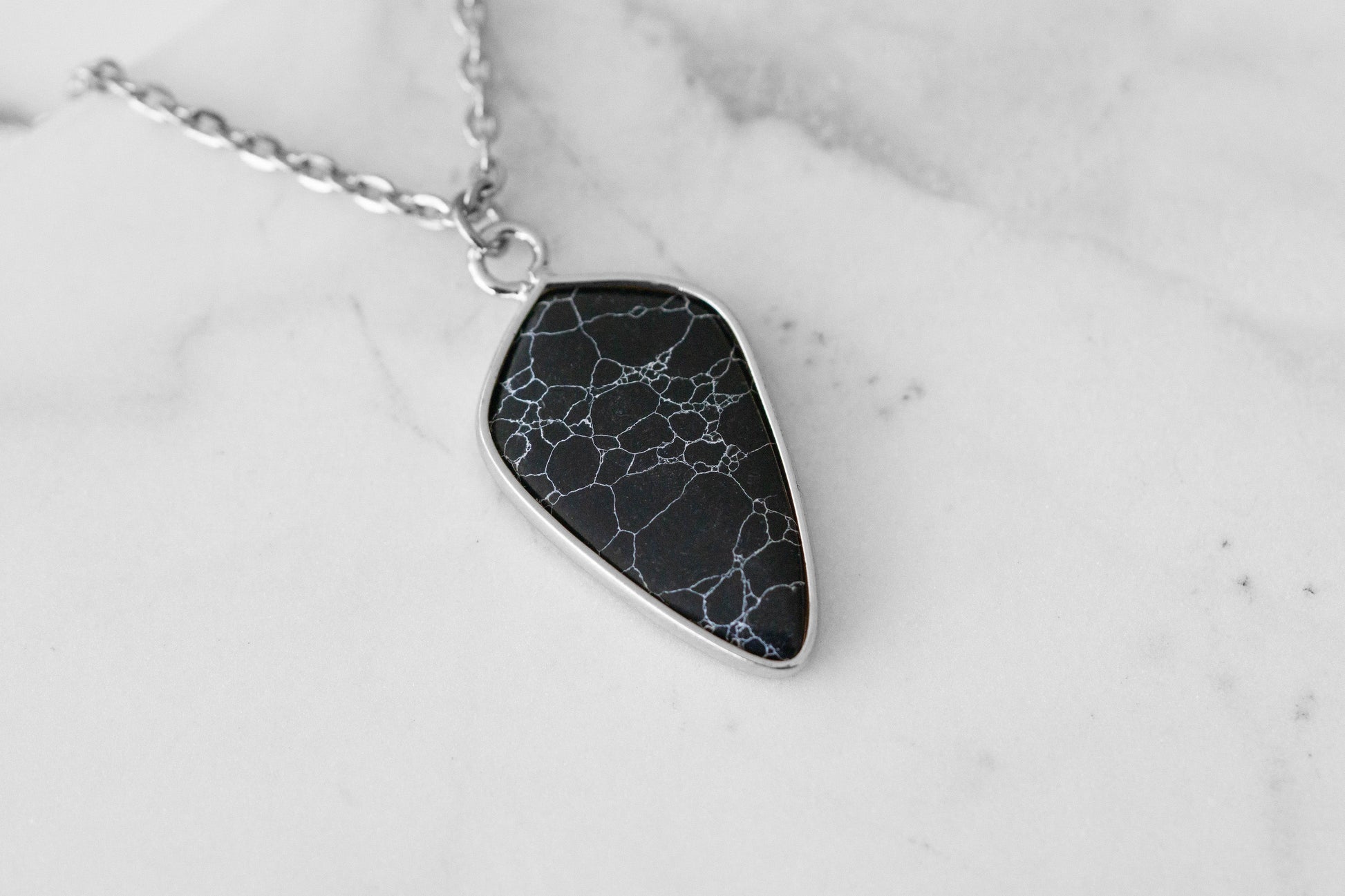 Silver And Black Dangle Natural Stone Crystal Gemstone Triangular Hypoallergenic Nickel Free Pendant Necklace. Custom Marquina Raw Natural Stone Accents And Designed With Love In Texas. Size 18 or 22 Inch Length, Plus 3 Inch Attached Necklace Extender With Custom Sizing Available On Select Pieces.