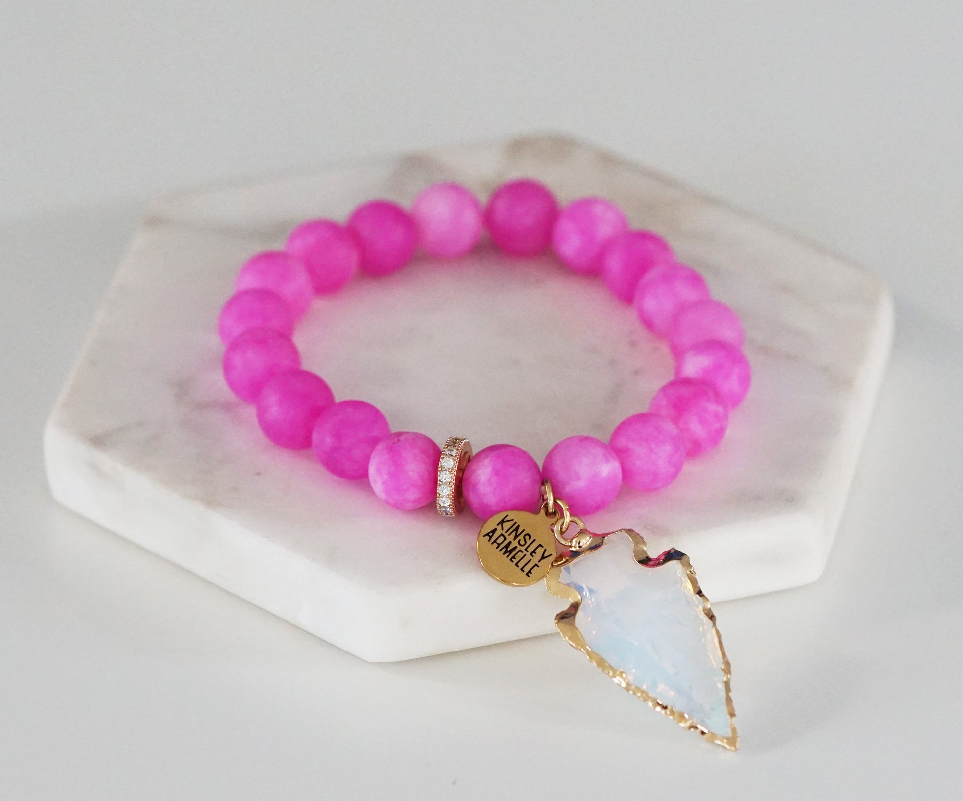 Gold And Pink Charm Iridescent Matte Natural Stone Hypoallergenic Nickel Free Beaded Stretch Bracelet. Custom Opal Arrowhead Accents And Designed With Love In Texas. Size Small, Medium, Large, and Extra Large Ranging From 6.25 - 7.25 Inch Circumference With Custom Sizing Available On Select Pieces.