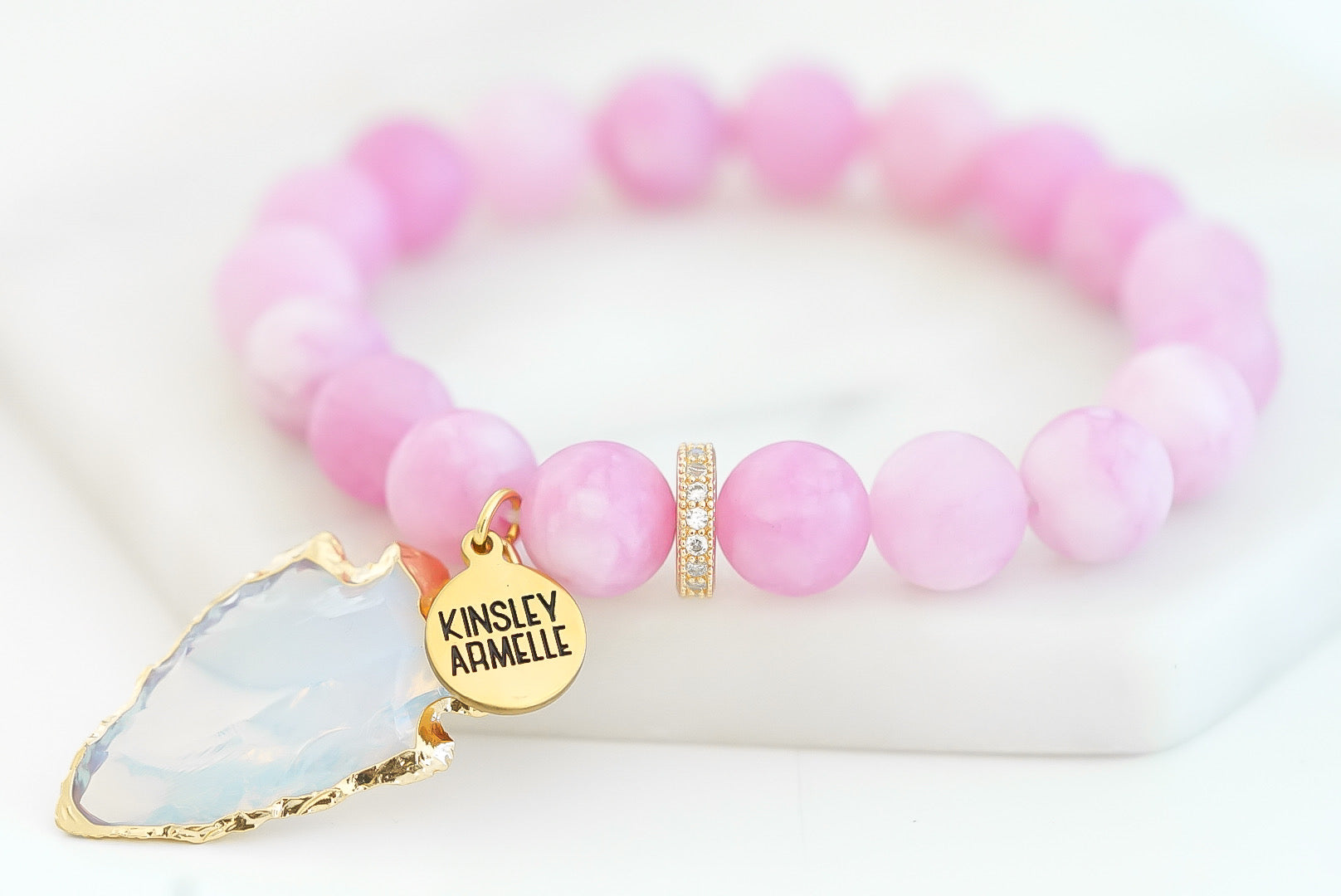 Gold And Pink Iridescent Matte Hypoallergenic Nickel Free Beaded Stretch Bracelet. Custom Opal Arrowhead Accents And Designed With Love In Texas. Size Small, Medium, Large, and Extra Large Ranging From 6.25 - 7.25 Inch Circumference With Custom Sizing Available On Select Pieces.