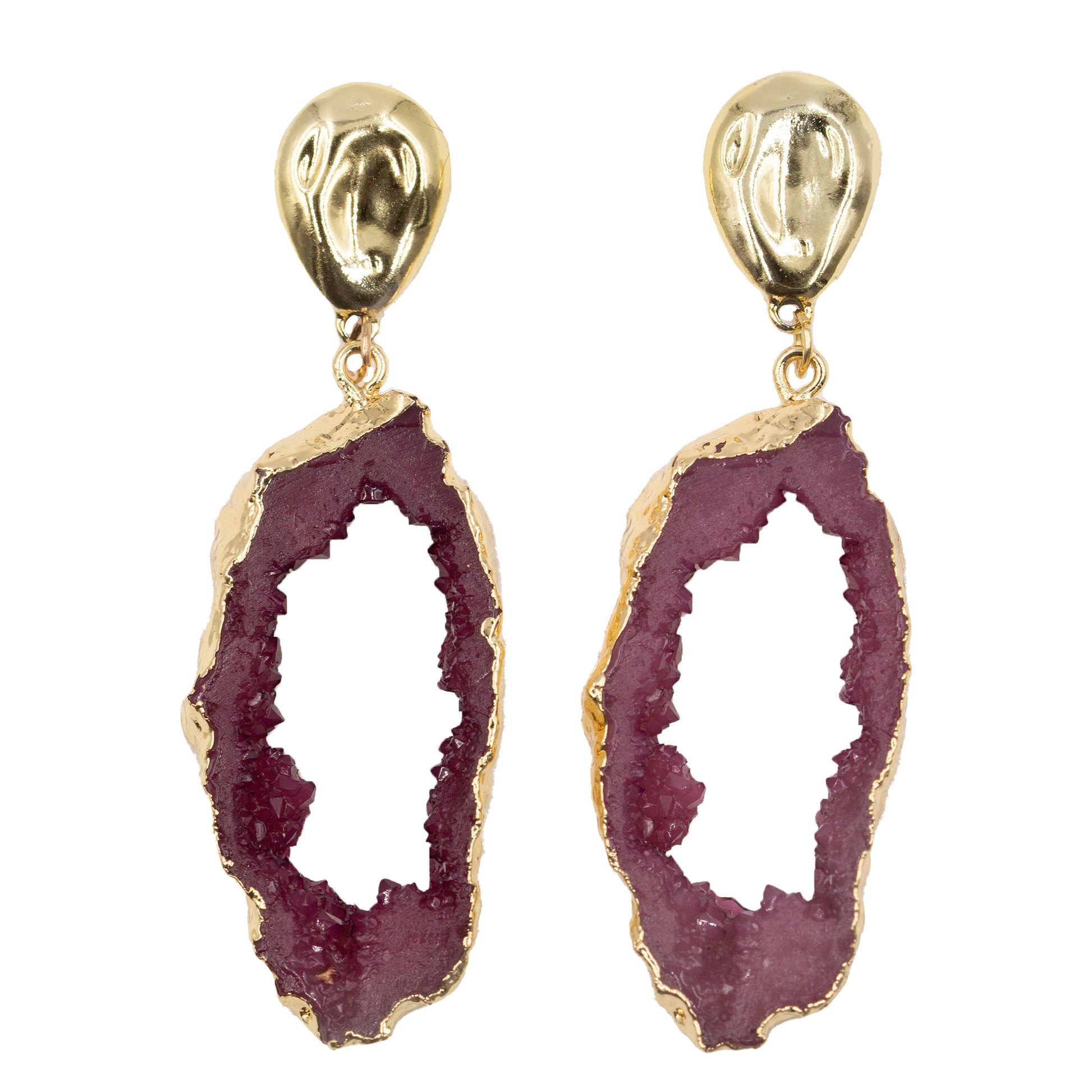 Gold And Purple Natural Stone Crystal Gemstone Shimmering Statement Drop Earrings. Custom Lucite Acrylic Geometric Shapes Accents And Designed With Love In Texas. Size 3 Inches Length x 0.75 Inches Width With Custom Sizing Available On Select Pieces.