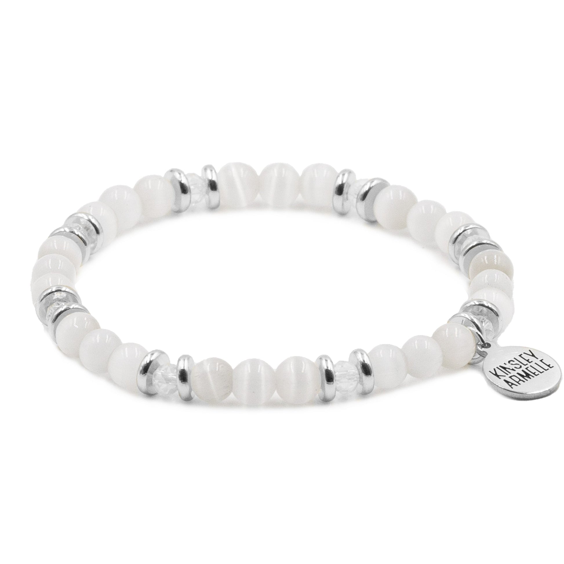 Silver And White Clear Natural Stone Station Hypoallergenic Nickel Free Beaded Stretch Bracelet. Custom Zircon Gemstones Decorative Accent Beads Accents And Designed With Love In Texas. Size Small, Medium, Large, and Extra Large Ranging From 6.25 - 7.25 Inch Circumference With Custom Sizing Available On Select Pieces.