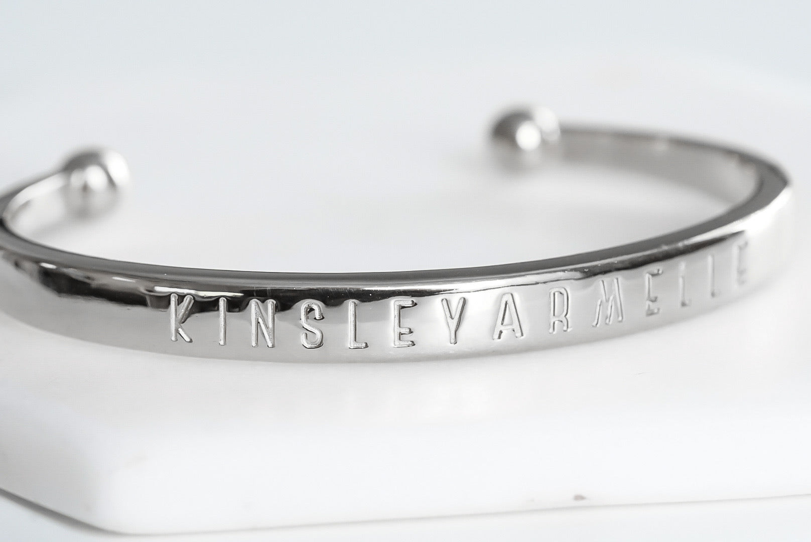 Silver Engraved Hypoallergenic Nickel Free All Metal Bangle Cuff Bracelet. Custom Engraving Accents And Designed With Love In Texas. Size Small, Medium, Large, and Extra Large Ranging From 6.25 - 7.25 Inch Circumference With Custom Sizing Available On Select Pieces.