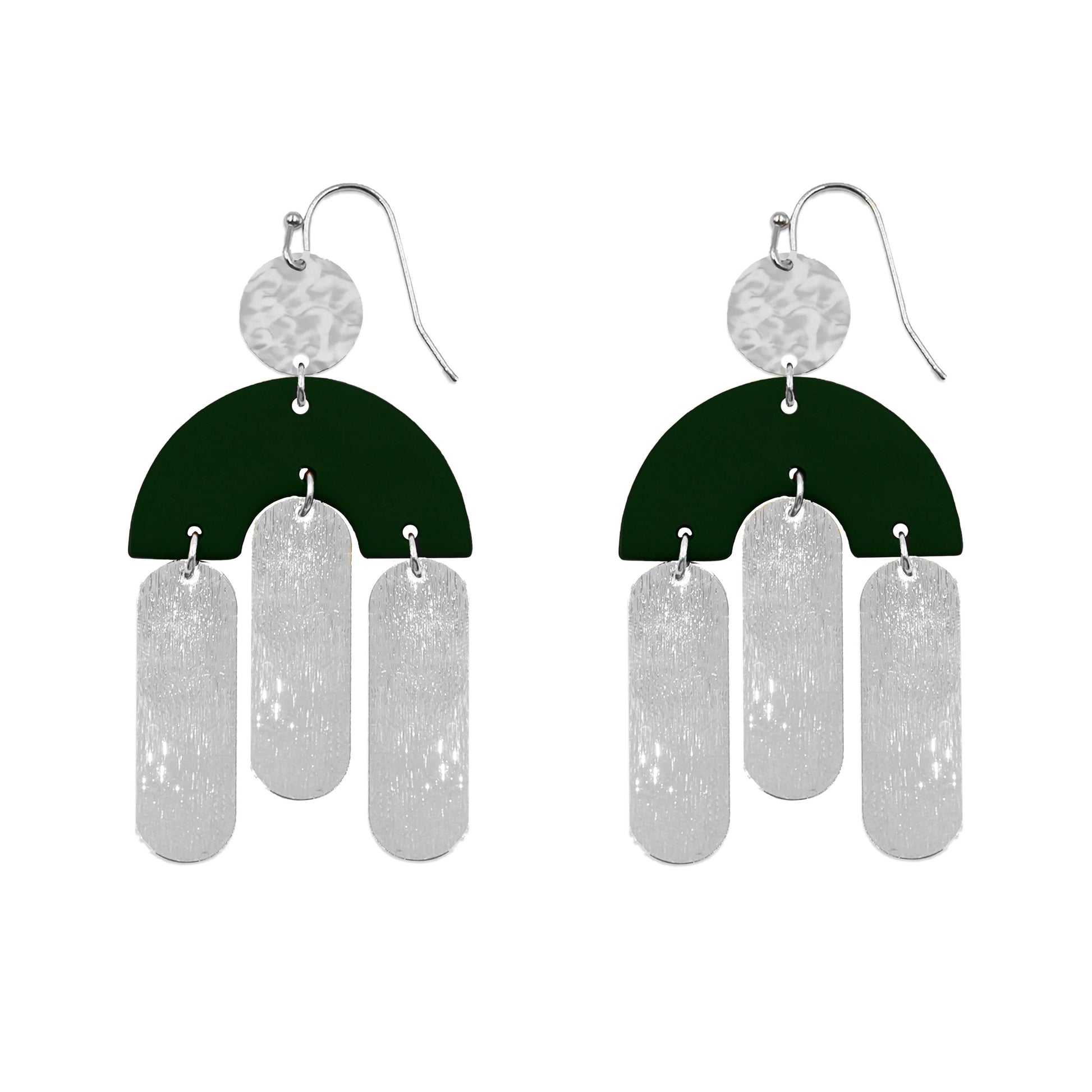 Silver And Green Bold Chunky Dangle Featherweight Hypoallergenic Nickel Free Drop Earrings. Custom Clay Geometric Shapes Accents And Designed With Love In Texas. Size 2.75 Inches Length x 1.5 Inches Width With Custom Sizing Available On Select Pieces.
