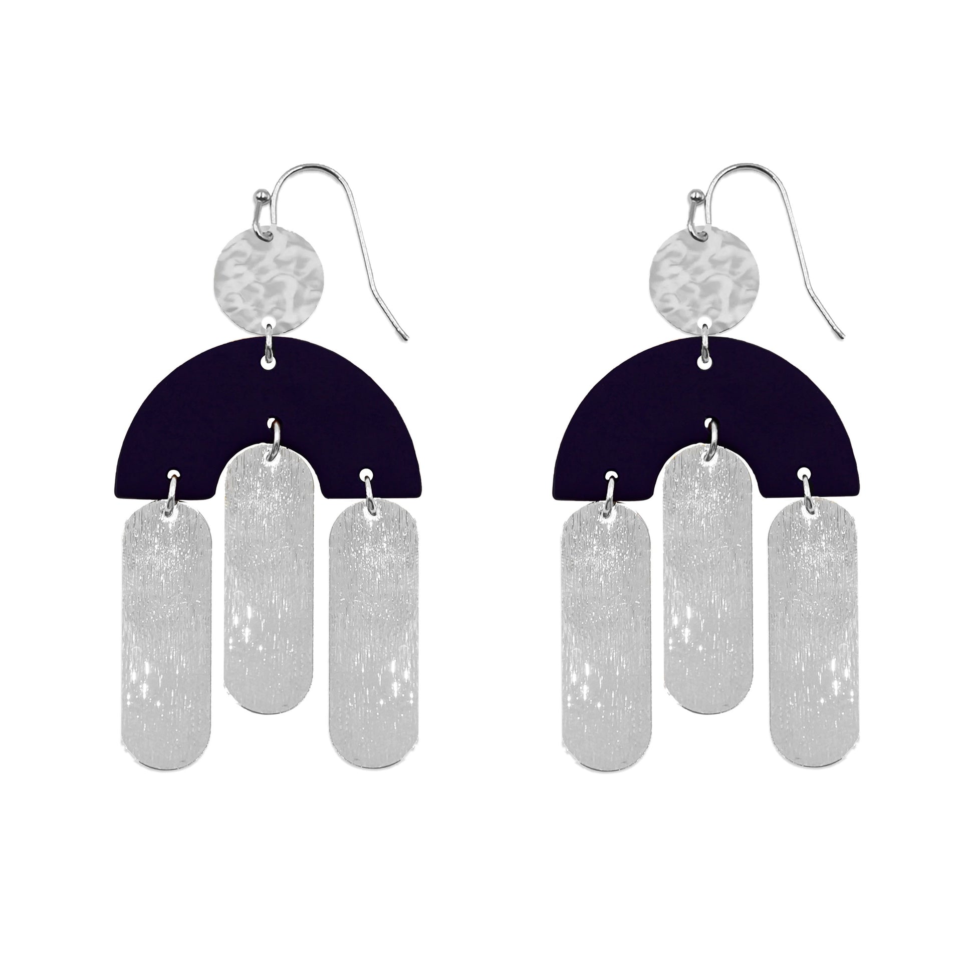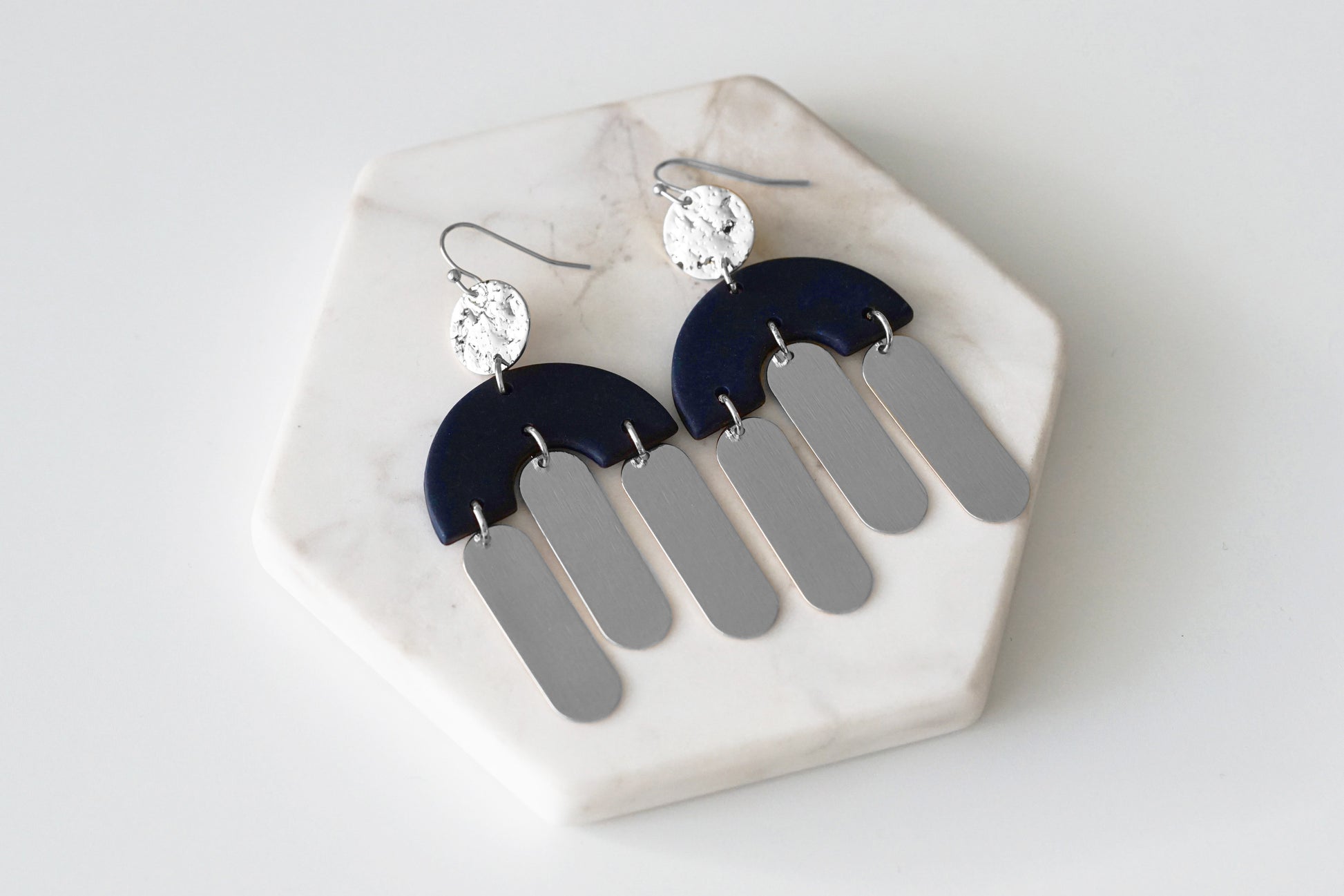 Silver And Blue Bold Chunky Dangle Featherweight Hypoallergenic Nickel Free Drop Earrings. Custom Clay Geometric Shapes Accents And Designed With Love In Texas. Size 2.75 Inches Length x 1.5 Inches Width With Custom Sizing Available On Select Pieces.