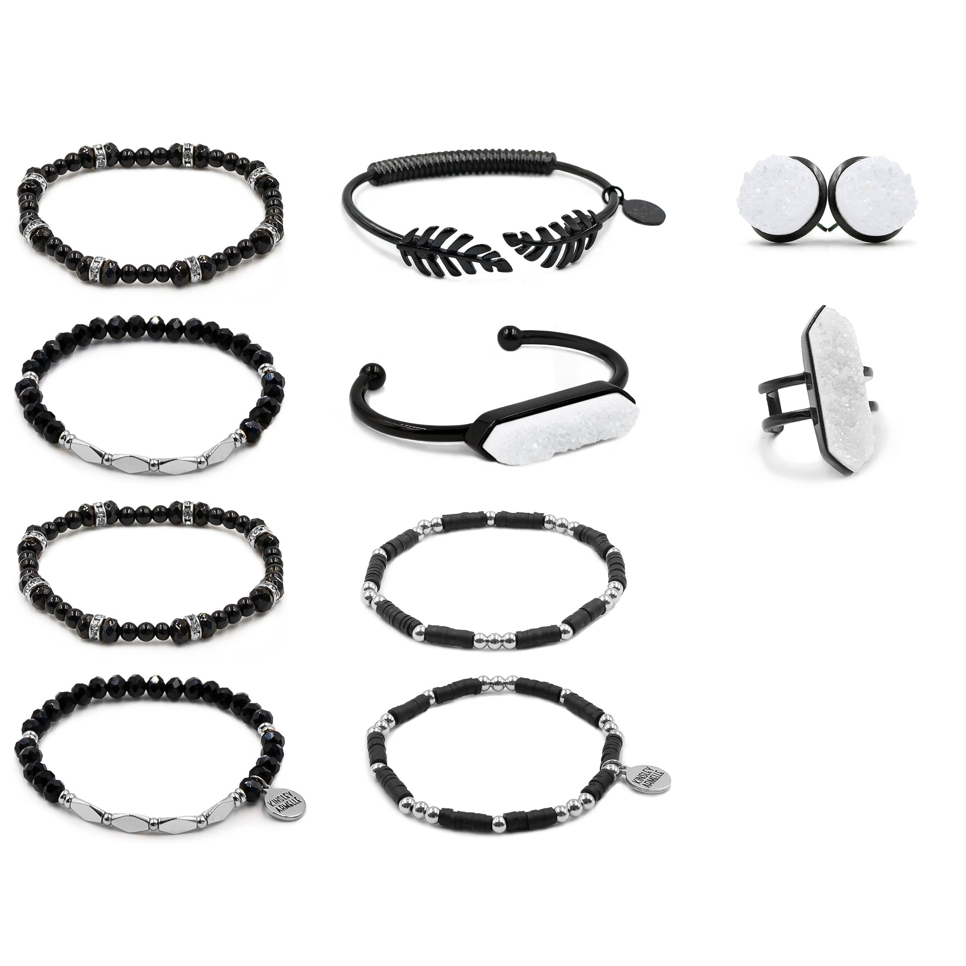 Silver And Black Beads Cuff Leaf Feather Stud Hypoallergenic Nickel Free Jewelry & Bracelet Stack Set. Custom Druzy Raw Natural Quartz Stone Accents And Designed With Love In Texas. Size Small, Medium, Large, and Extra Large Ranging From 6.25 - 7.25 Inch Circumference With Custom Sizing Available On Select Pieces.