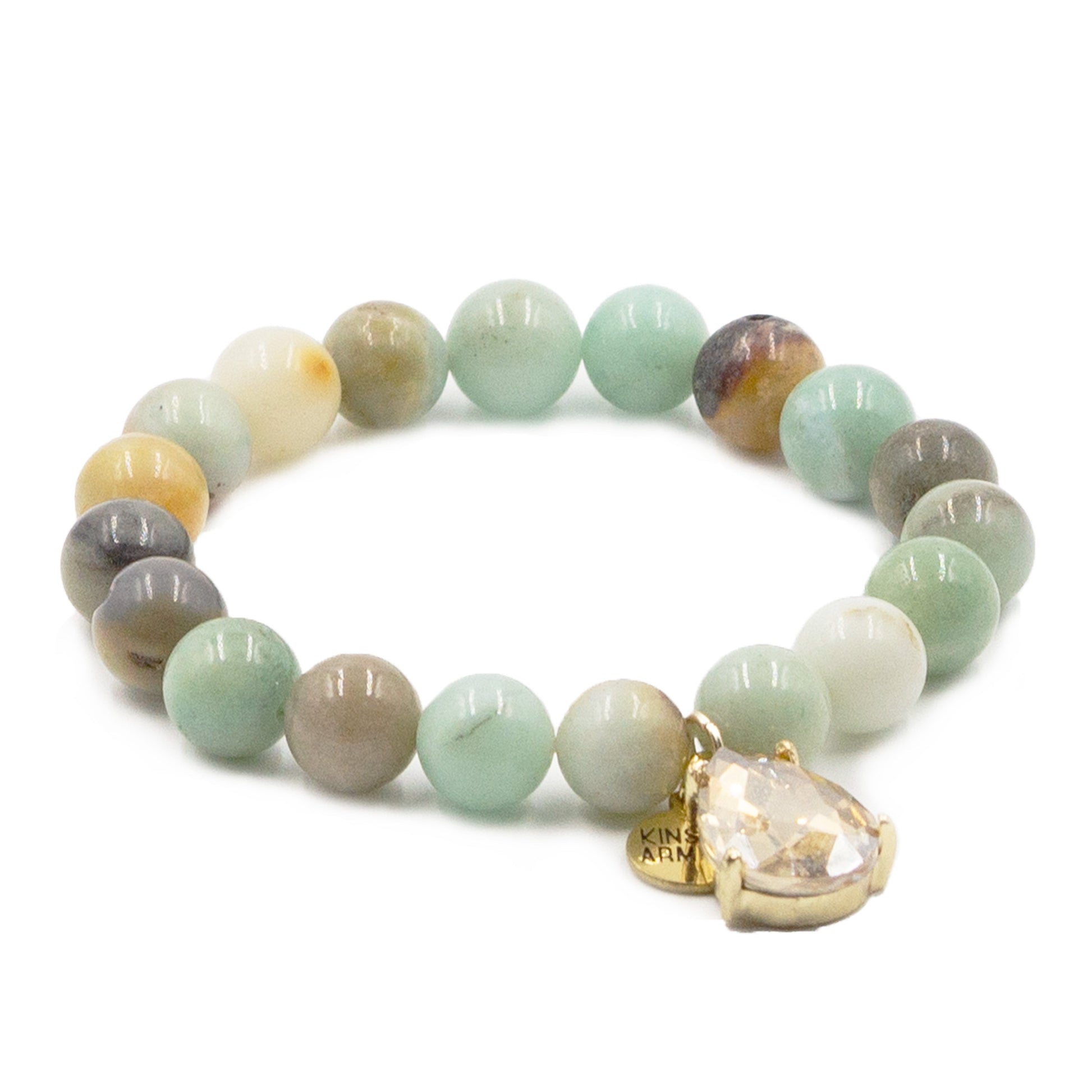 Gold And Light Blue Diamond Mint Multicolored Natural Stone Tear Drop Hypoallergenic Nickel Free Beaded Stretch Bracelet. Custom Glass Charm Accents And Designed With Love In Texas. Size Small, Medium, Large, and Extra Large Ranging From 6.25 - 7.25 Inch Circumference With Custom Sizing Available On Select Pieces.