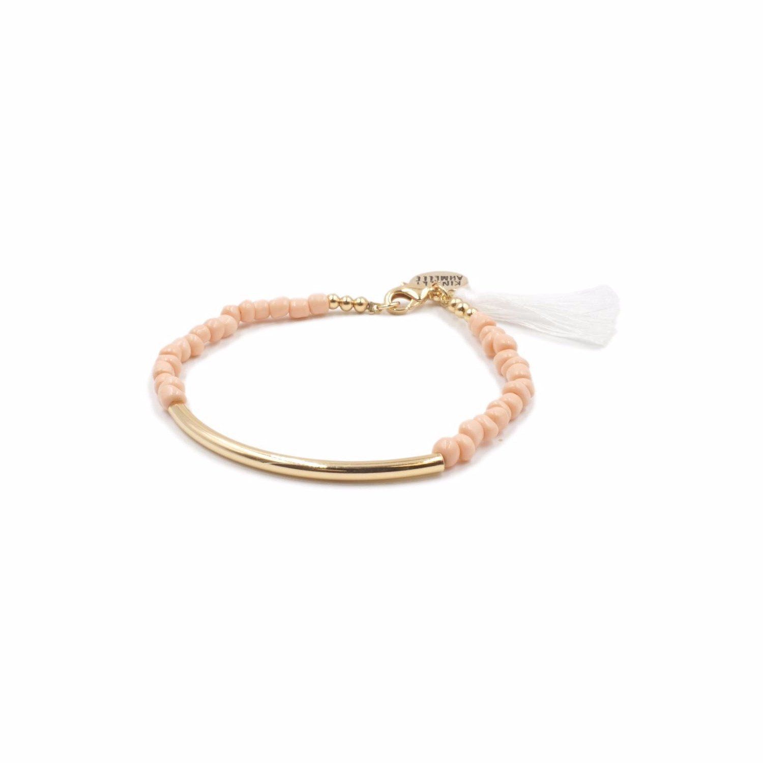 Gold And Pink Huichol Tassel Hypoallergenic Nickel Free Dainty Beaded Stretch Bracelet. Custom 18K Yellow Gold Ion Plated Stainless Steel Smooth Bar Accents And Designed With Love In Texas. Size Small, Medium, Large, and Extra Large Ranging From 6.25 - 7.25 Inch Circumference With Custom Sizing Available On Select Pieces.