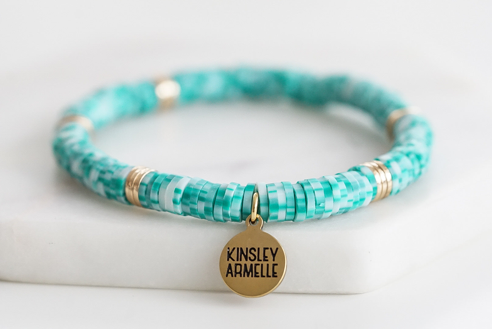 Gold And Light Blue Disc Heishi Station Hypoallergenic Nickel Free Beaded Stretch Bracelet. Custom Decorative Accent Beads Accents And Designed With Love In Texas. Size Small, Medium, Large, and Extra Large Ranging From 6.25 - 7.25 Inch Circumference With Custom Sizing Available On Select Pieces.