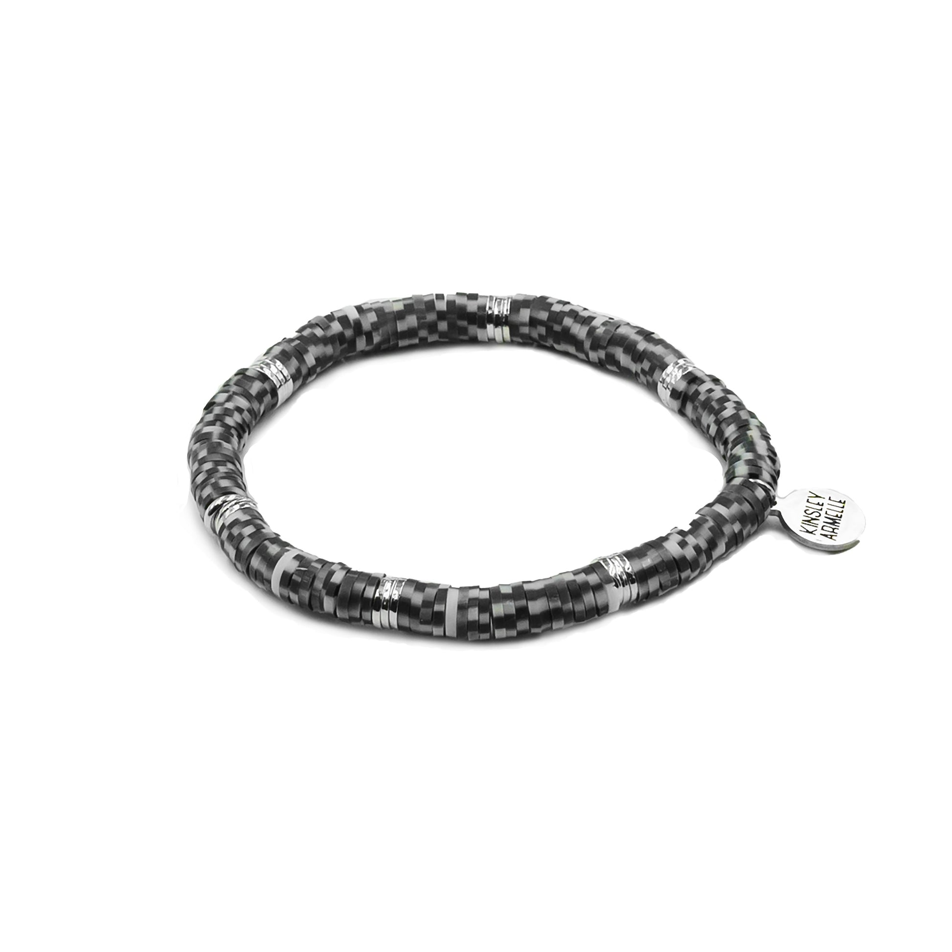 Silver And Black Dalmatian Disc Heishi Station Hypoallergenic Nickel Free Beaded Stretch Bracelet. Custom Decorative Accent Beads Accents And Designed With Love In Texas. Size Small, Medium, Large, and Extra Large Ranging From 6.25 - 7.25 Inch Circumference With Custom Sizing Available On Select Pieces.