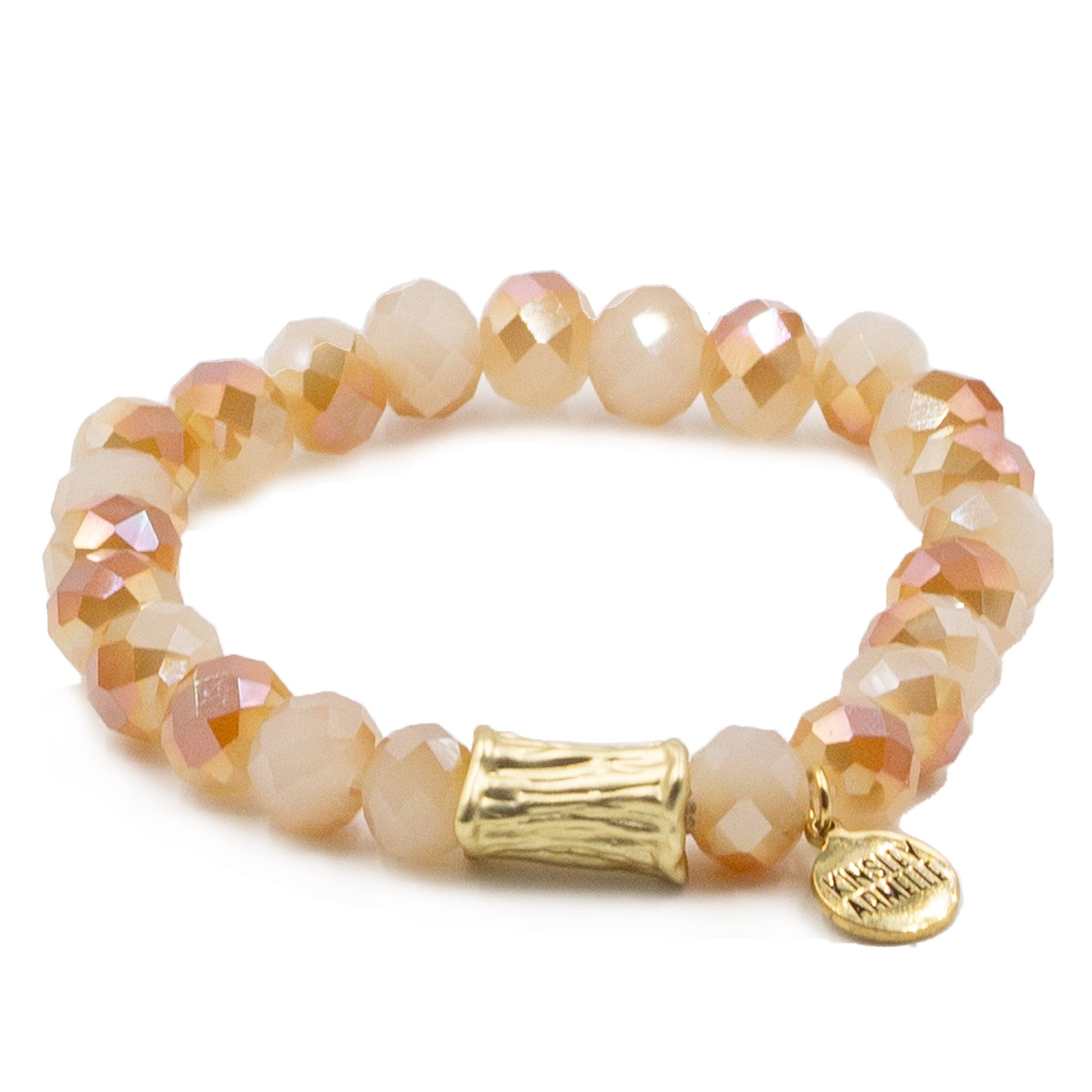 Gold And Orange Boho Faceted Multicolored Shimmering Sparkling Hypoallergenic Nickel Free Beaded Stretch Bracelet. Custom 18K Yellow Gold Plated Brass Hammered Bar Accents And Designed With Love In Texas. Size Small, Medium, Large, and Extra Large Ranging From 6.25 - 7.25 Inch Circumference With Custom Sizing Available On Select Pieces.