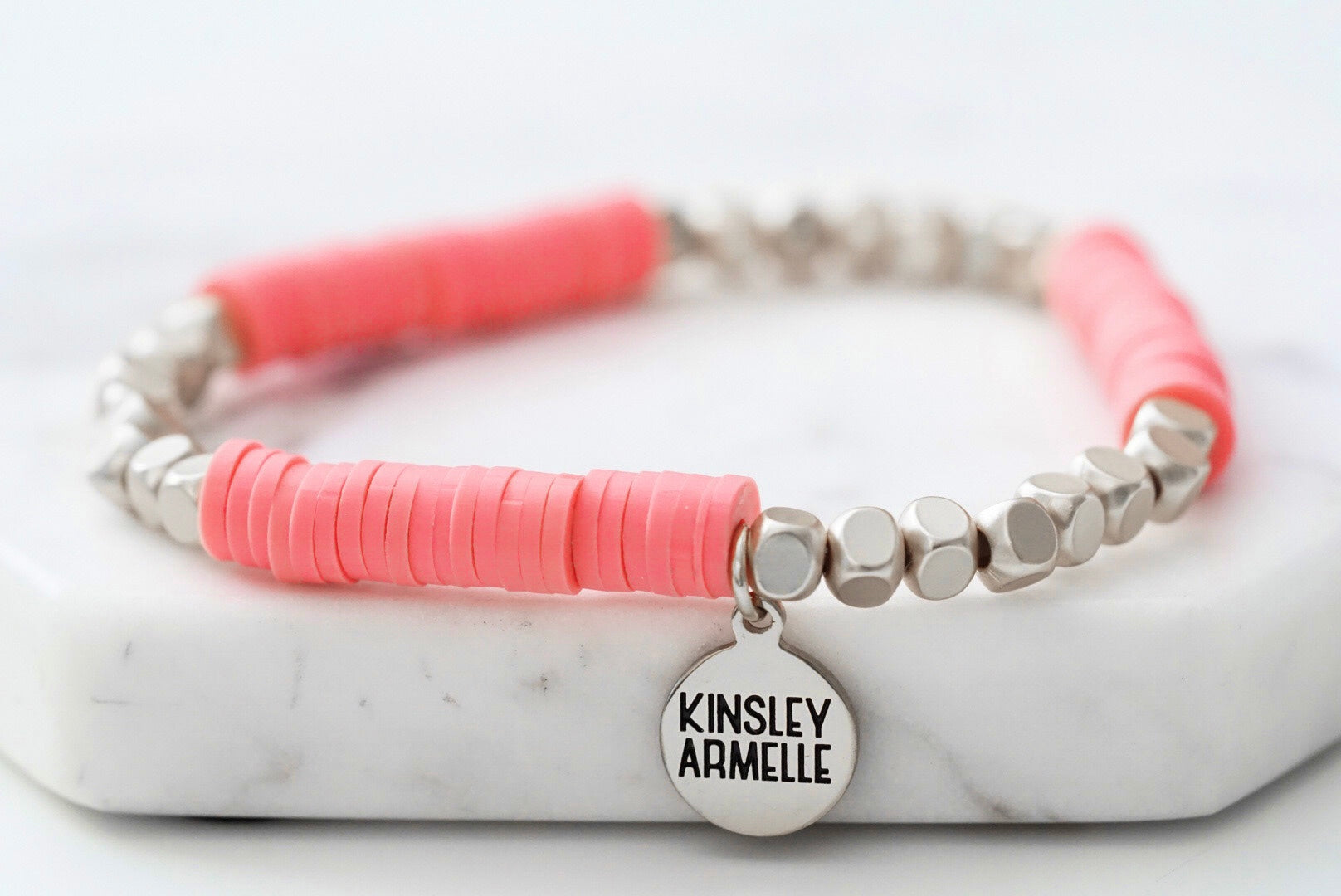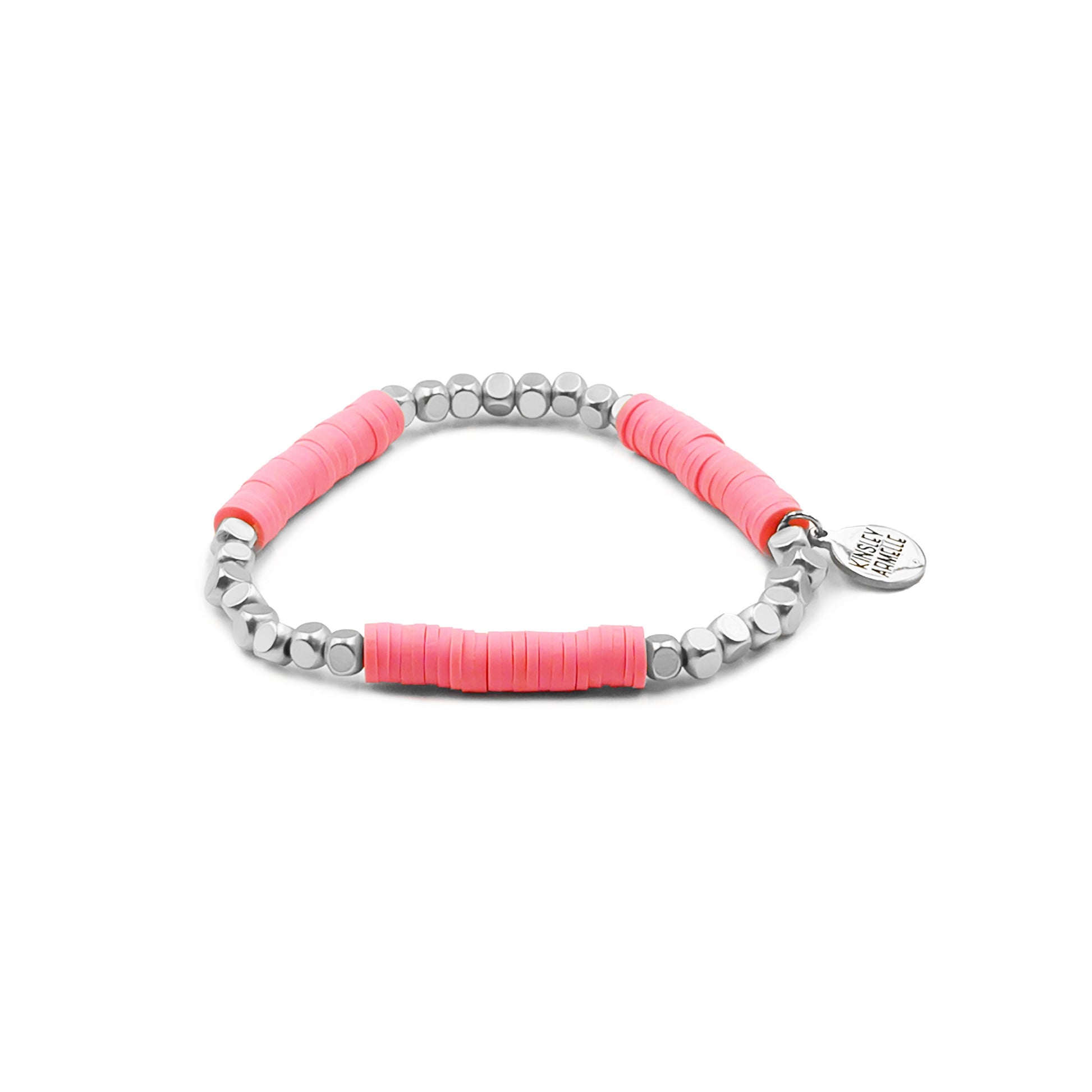 Silver And Pink Disc Heishi Station Hypoallergenic Nickel Free Beaded Stretch Bracelet. Custom Decorative Accent Beads Accents And Designed With Love In Texas. Size Small, Medium, Large, and Extra Large Ranging From 6.25 - 7.25 Inch Circumference With Custom Sizing Available On Select Pieces.