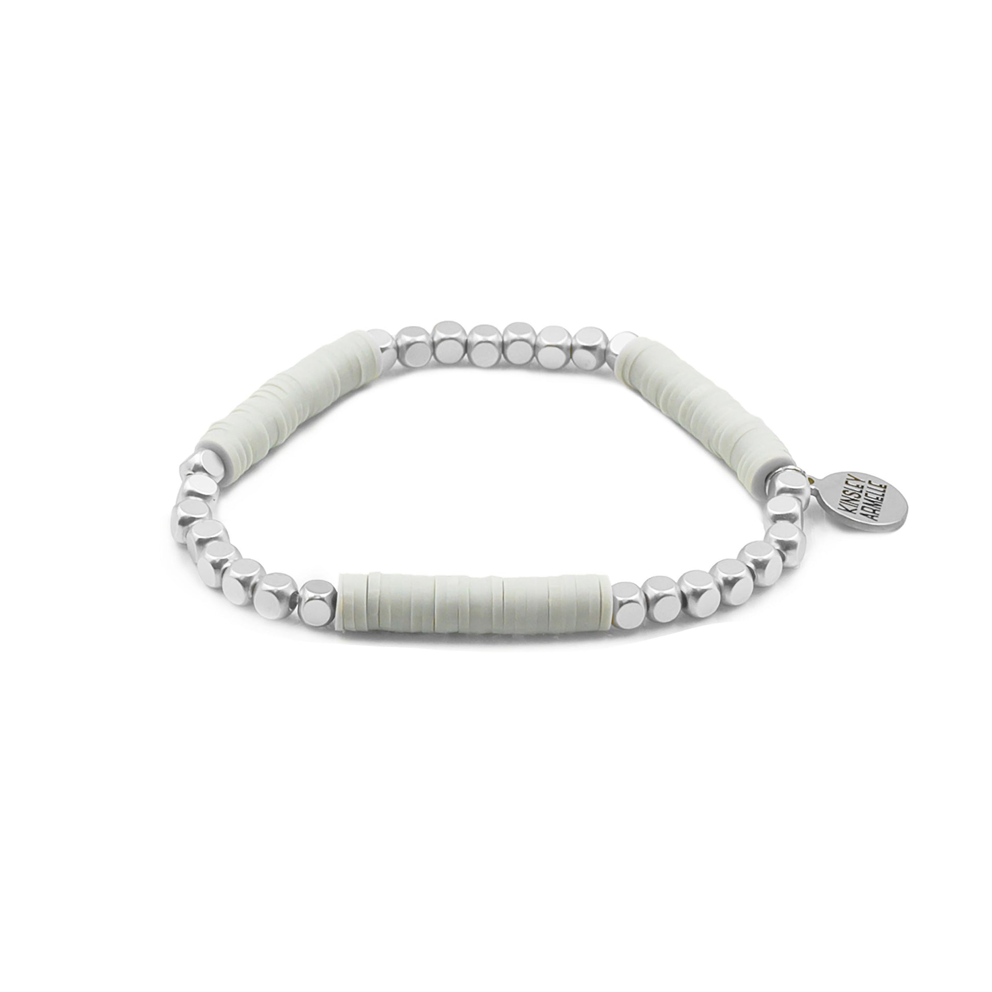 Silver And Gray Disc Heishi Station Hypoallergenic Nickel Free Beaded Stretch Bracelet. Custom Decorative Accent Beads Accents And Designed With Love In Texas. Size Small, Medium, Large, and Extra Large Ranging From 6.25 - 7.25 Inch Circumference With Custom Sizing Available On Select Pieces.