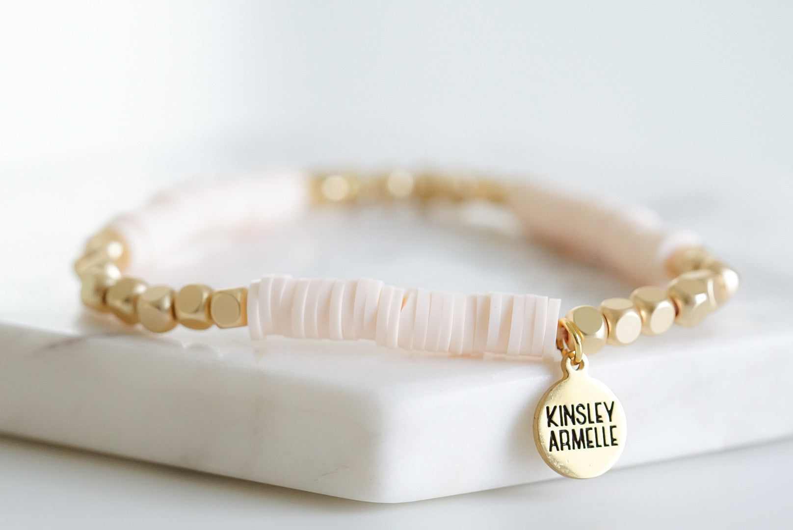Gold And Brown Disc Heishi Station Hypoallergenic Nickel Free Beaded Stretch Bracelet. Custom Decorative Accent Beads Accents And Designed With Love In Texas. Size Small, Medium, Large, and Extra Large Ranging From 6.25 - 7.25 Inch Circumference With Custom Sizing Available On Select Pieces.