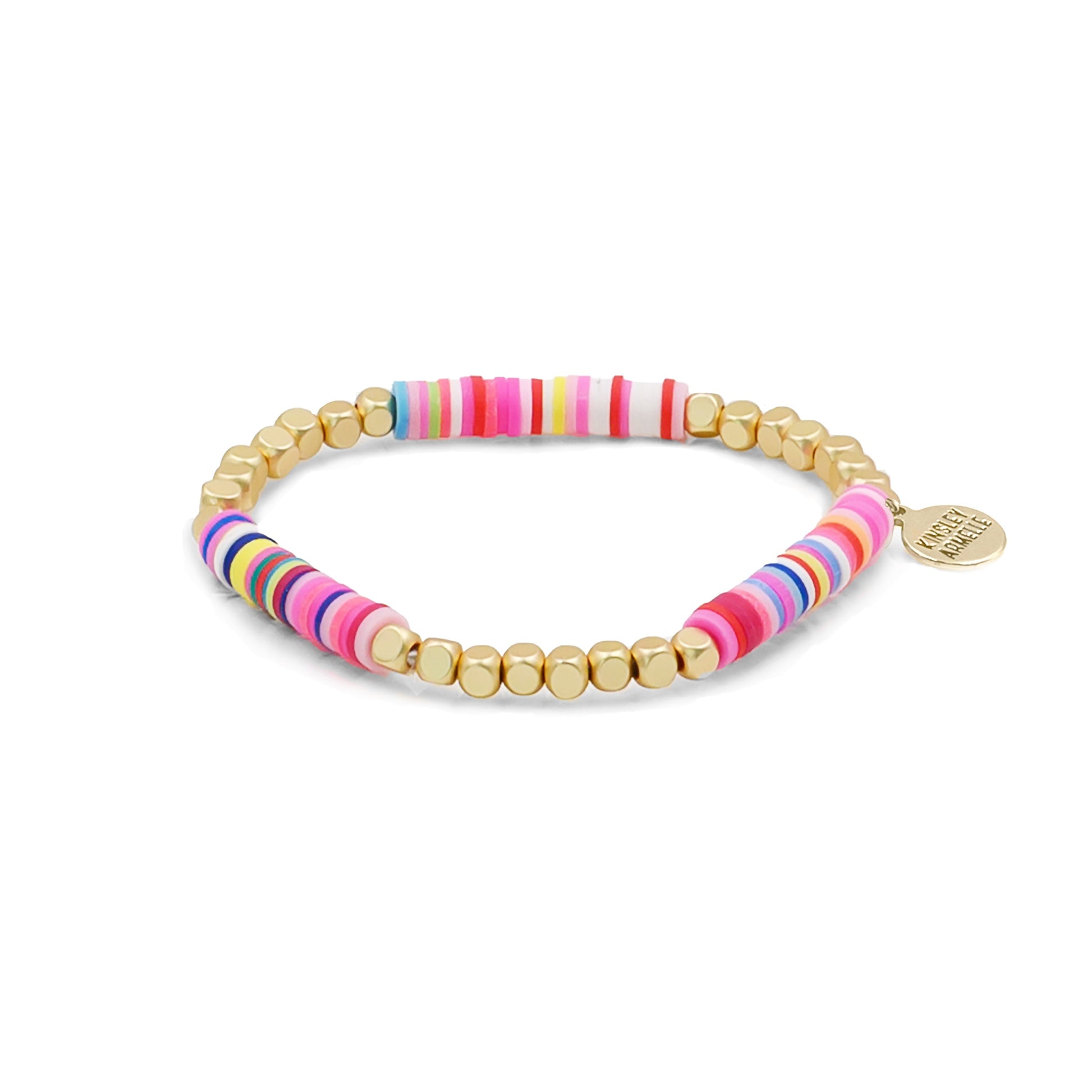 Gold And Pink Colorful Disc Heishi Multicolored Rainbow Station Hypoallergenic Nickel Free Beaded Stretch Bracelet. Custom Decorative Accent Beads Accents And Designed With Love In Texas. Size Small, Medium, Large, and Extra Large Ranging From 6.25 - 7.25 Inch Circumference With Custom Sizing Available On Select Pieces.