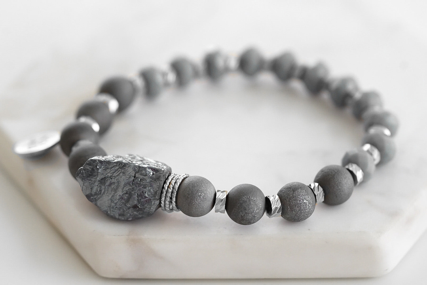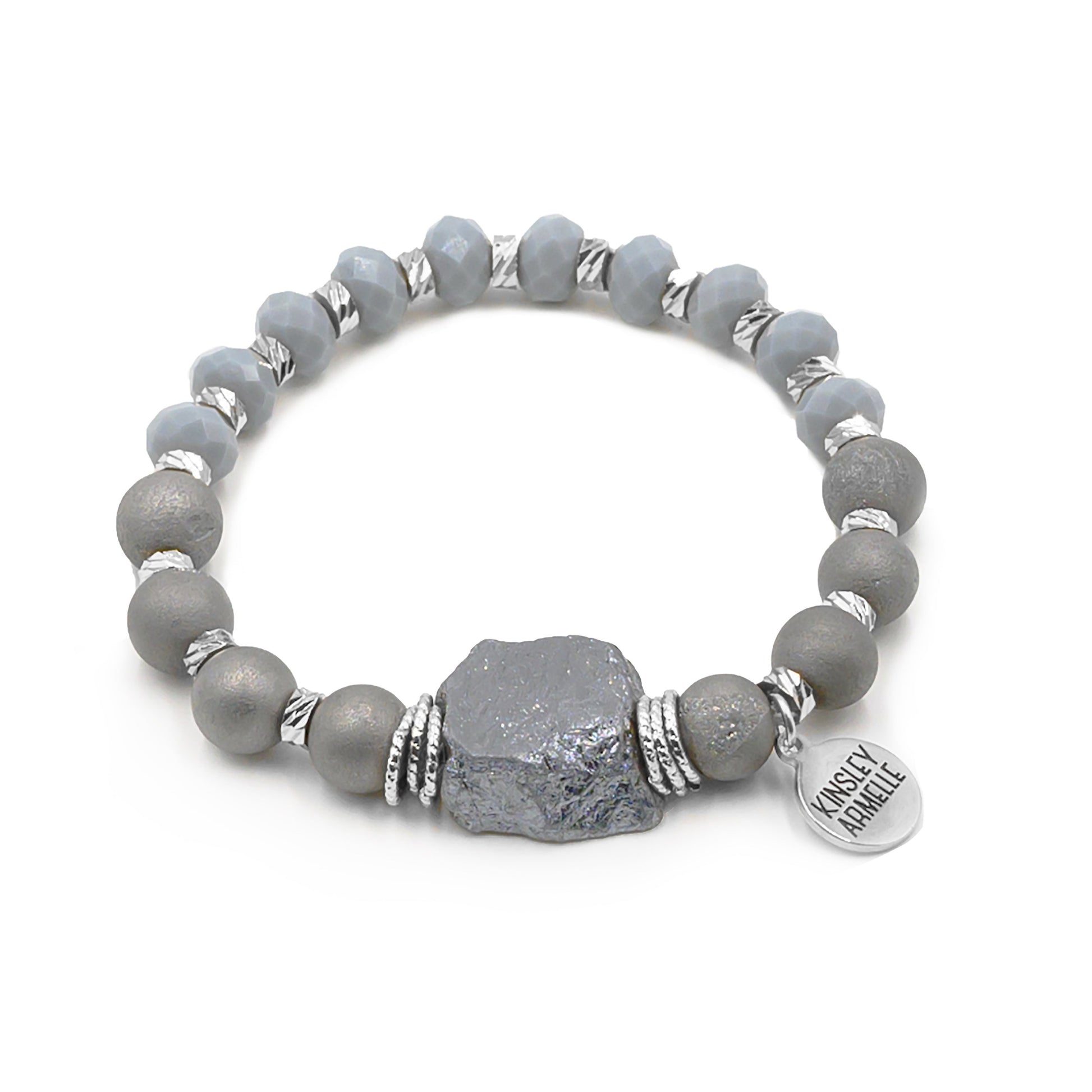 Silver And Gray Asymmetrical Faceted Nugget Hypoallergenic Nickel Free Beaded Stretch Bracelet. Custom Glass Decorative Accent Beads Accents And Designed With Love In Texas. Size Small, Medium, Large, and Extra Large Ranging From 6.25 - 7.25 Inch Circumference With Custom Sizing Available On Select Pieces.
